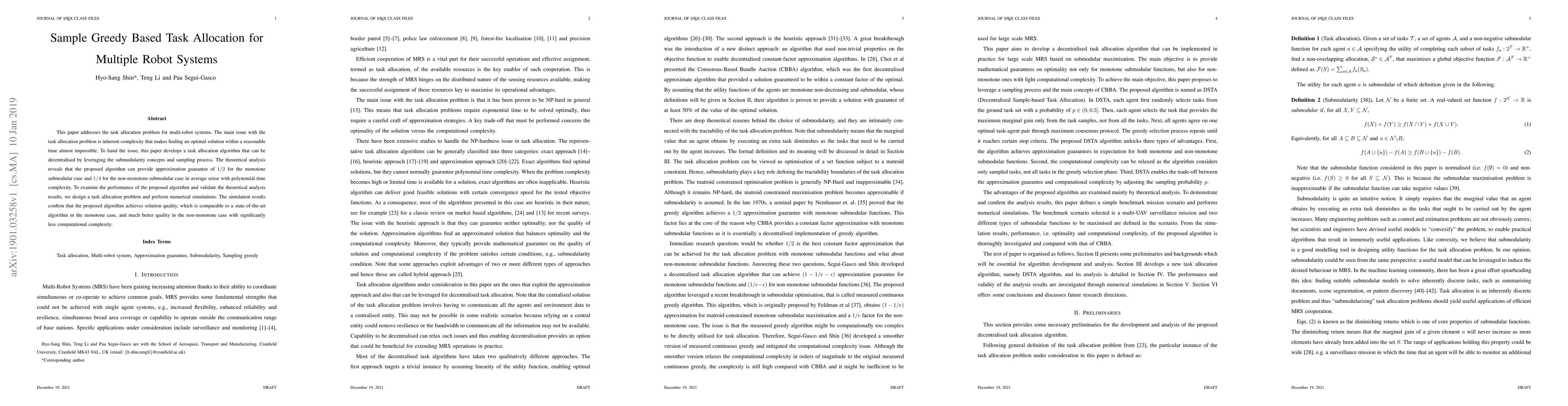 This paper addresses the task allocation problem for multi-robot systems. The main issue with the task allocation problem is inherent complexity that makes finding an optimal solution within a reasonable time almost impossible. To hand the issue, this paper develops a task allocation algorithm that can be decentralised by leveraging the submodularity concepts and sampling process. The theoretical analysis reveals that the proposed algorithm can provide approximation guarantee of $1/2$ for the monotone submodular case and $1/4$ for the non-monotone submodular case in average sense with polynomial time complexity. To examine the performance of the proposed algorithm and validate the theoretical analysis results, we design a task allocation problem and perform numerical simulations. The simulation results confirm that the proposed algorithm achieves solution quality, which is comparable to a state-of-the-art algorithm in the monotone case, and much better quality in the non-monotone case with significantly less computational complexity.