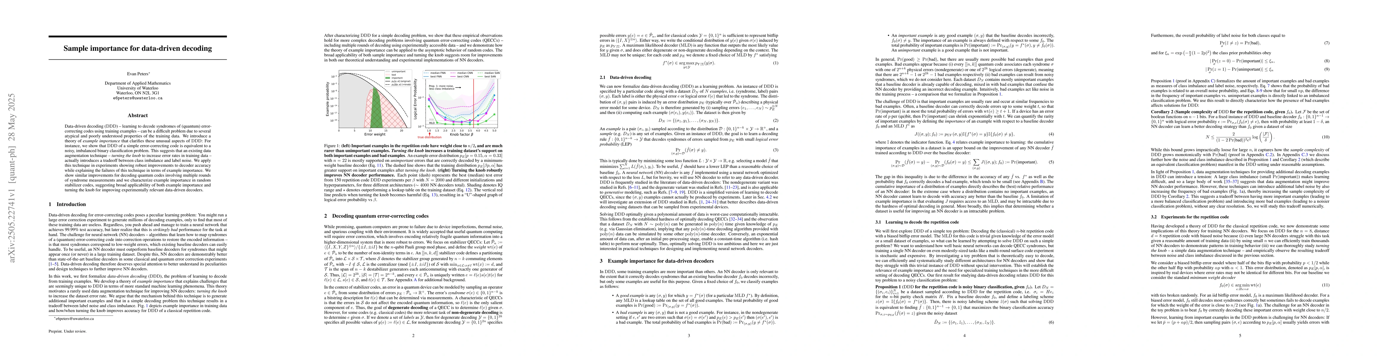 Data-driven decoding (DDD) -- learning to decode syndromes of (quantum) error-correcting codes using training examples -- can be a difficult problem due to several atypical and poorly understood properties of the training data. We introduce a theory of example importance that clarifies these unusual aspects of DDD: For instance, we show that DDD of a simple error-correcting code is equivalent to a noisy, imbalanced binary classification problem. This suggests that an existing data augmentation technique -- turning the knob to increase error rates in training data -- actually introduces a tradeoff between class imbalance and label noise. We apply this technique in experiments showing robust improvements to decoder accuracy while explaining the failures of this technique in terms of example importance. We show similar improvements for decoding quantum codes involving multiple rounds of syndrome measurements and we characterize example importance in random stabilizer codes, suggesting broad applicability of both example importance and turning the knob for improving experimentally relevant data-driven decoders.