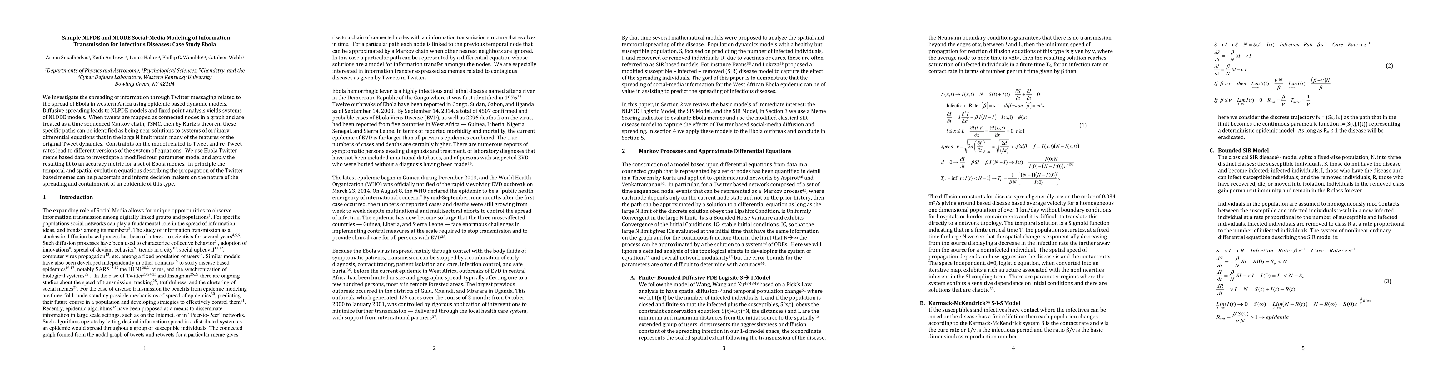 We investigate the spreading of information through Twitter messaging related to the spread of Ebola in western Africa using epidemic based dynamic models. Diffusive spreading leads to NLPDE models and fixed point analysis yields systems of NLODE models. When tweets are mapped as connected nodes in a graph and are treated as a time sequenced Markov chain, TSMC, then by the Kurtz theorem these specific paths can be identified as being near solutions to systems of ordinary differential equations that in the large N limit retain many of the features of the original Tweet dynamics. Constraints on the model related to Tweet and re-Tweet rates lead to different versions of the system of equations. We use Ebola Twitter meme based data to investigate a modified four parameter model and apply the resulting fit to an accuracy metric for a set of Ebola memes. In principle the temporal and spatial evolution equations describing the propagation of the Twitter based memes can help ascertain and inform decision makers on the nature of the spreading and containment of an epidemic of this type.
