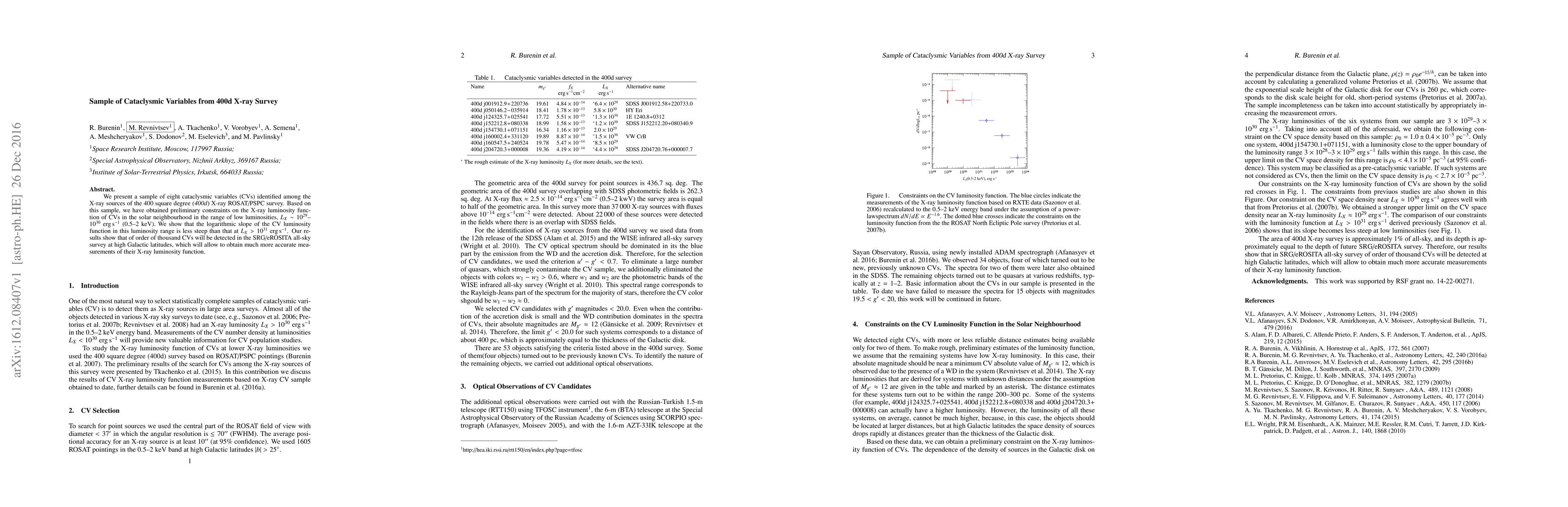 We present a sample of eight cataclysmic variables (CVs) identified among the X-ray sources of the 400 square degree (400d) X-ray ROSAT/PSPC survey. Based on this sample, we have obtained preliminary constraints on the X-ray luminosity function of CVs in the solar neighbourhood in the range of low luminosities, L_X=~1e29-1e30 erg/s (0.5-2 keV). We show that the logarithmic slope of the CV luminosity function in this luminosity range is less steep than that at L_X>1e31 erg/s. Our results show that of order of thousand CVs will be detected in the SRG/eROSITA all-sky survey at high Galactic latitudes, which will allow to obtain much more accurate measurements of their X-ray luminosity function.