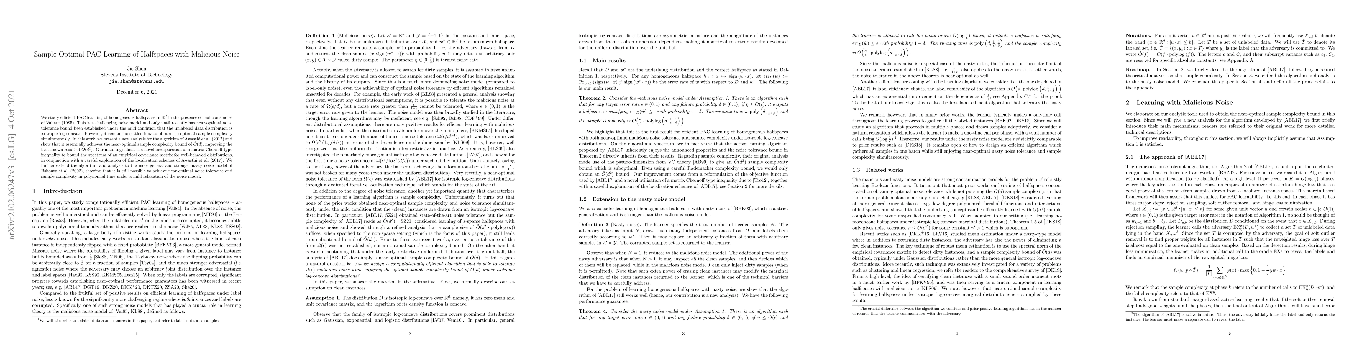 This paper presents a new analysis showing that the algorithm of Awasthi et al. (2017) achieves near-optimal sample complexity of $\tilde{O}(d)$ for learning halfspaces under malicious noise, improving previous results. The authors utilize a matrix Chernoff-type inequality and localization schemes to extend their findings to the nasty noise model.