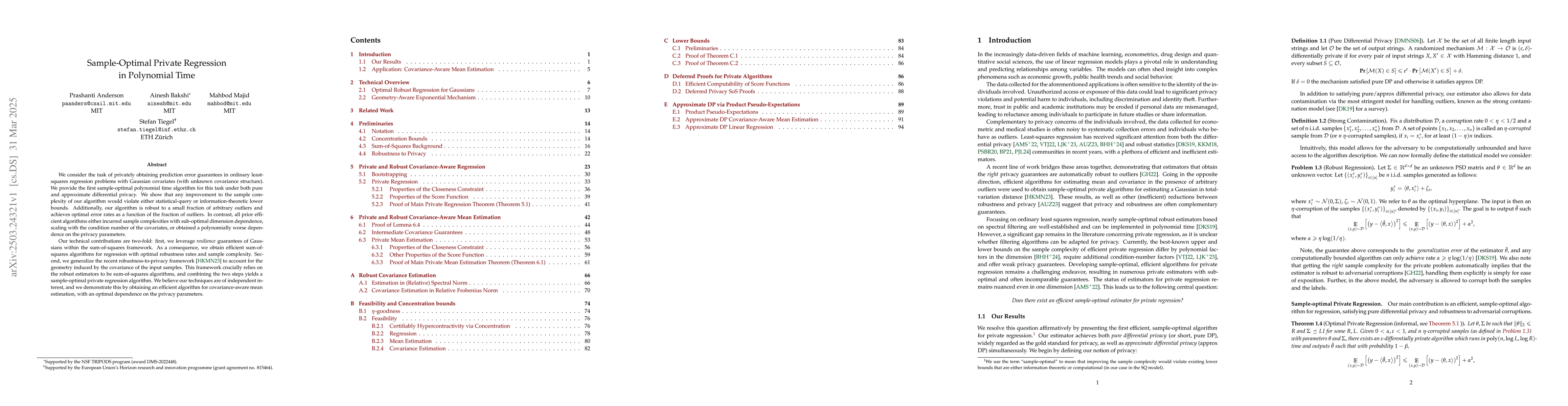 The paper introduces efficient sum-of-squares algorithms for regression with optimal robustness rates and sample complexity, and generalizes the robustness-to-privacy framework to consider sample covariance geometry.