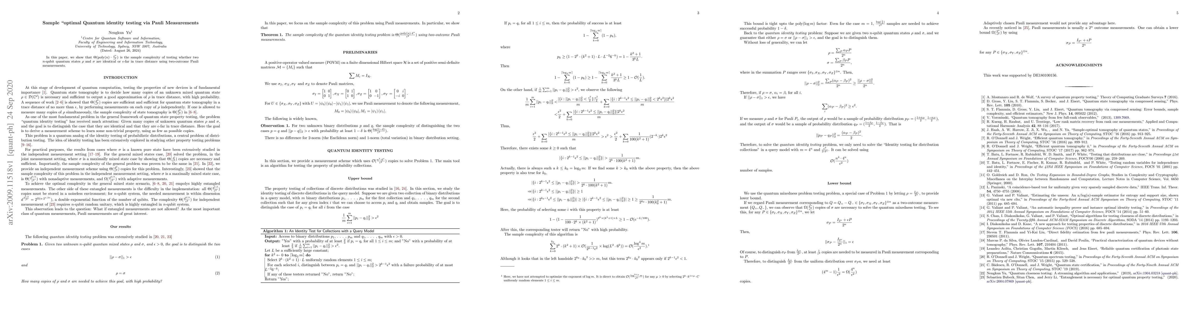 In this paper, we show that $\Theta(\mathrm{poly}(n)\cdot\frac{4^n}{\epsilon^2})$ is the sample complexity of testing whether two $n$-qubit quantum states $\rho$ and $\sigma$ are identical or $\epsilon$-far in trace distance using two-outcome Pauli measurements.
