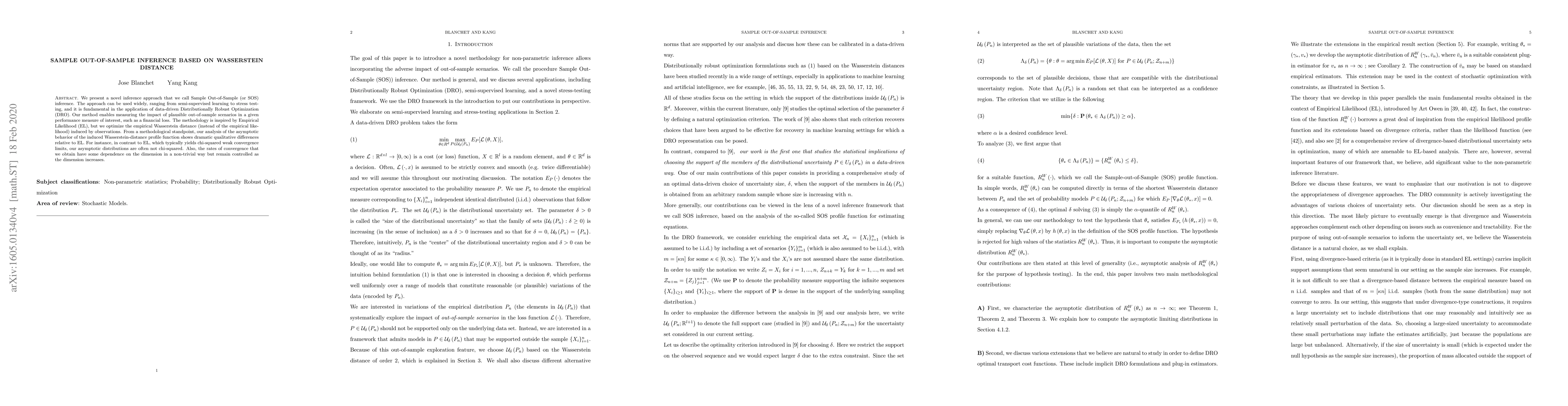 This paper introduces Sample Out-of-Sample (SOS) inference, a novel method based on optimizing the empirical Wasserstein distance for measuring out-of-sample scenarios' impact. Unlike Empirical Likelihood, SOS inference shows different asymptotic behaviors and controlled convergence rates that depend on the dimension.