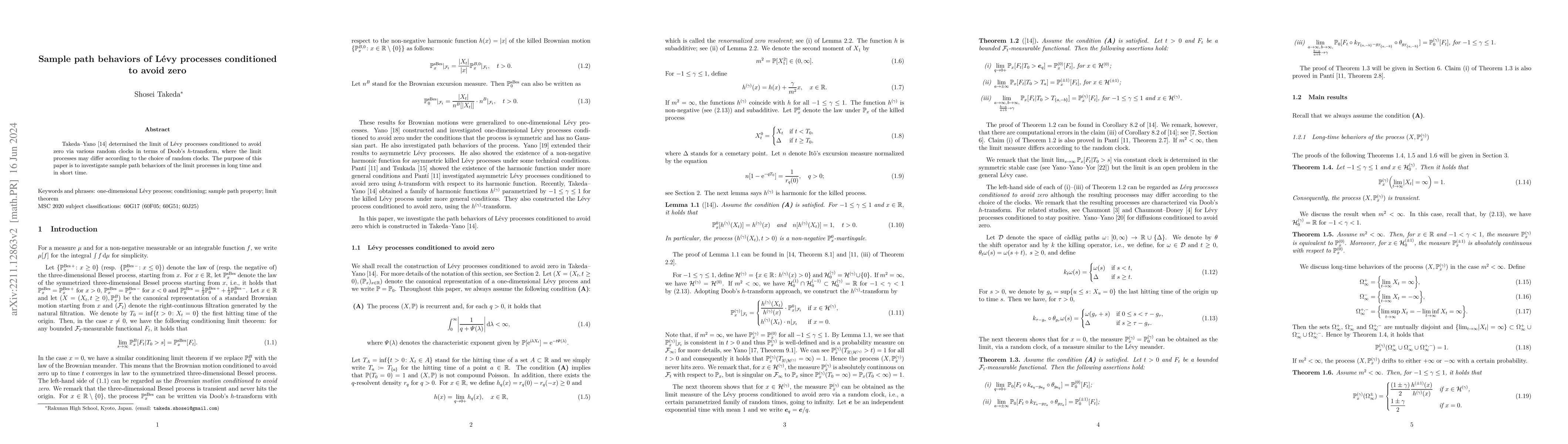 This paper investigates the sample path behaviors of Lévy processes conditioned to avoid zero, determined by Takeda-Yano using Doob's $h$-transform, focusing on both long-time and short-time limits. The study highlights how different random clocks can yield distinct limit processes.