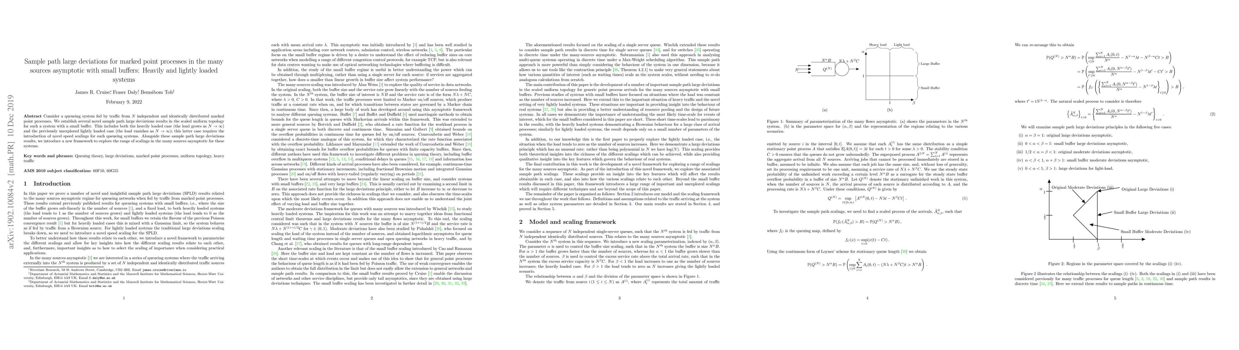 Consider a queueing system fed by traffic from $N$ independent and identically distributed marked point processes. We establish several novel sample path large deviations results in the scaled uniform topology for such a system with a small buffer. This includes both the heavily loaded case (the load grows as $N\rightarrow\infty$) and the previously unexplored lightly loaded case (the load vanishes as $N\rightarrow\infty$); this latter case requires the introduction of novel speed scalings for such queueing systems. Alongside these sample path large deviations results, we introduce a new framework to explore the range of scalings in the many sources asymptotic for these systems.