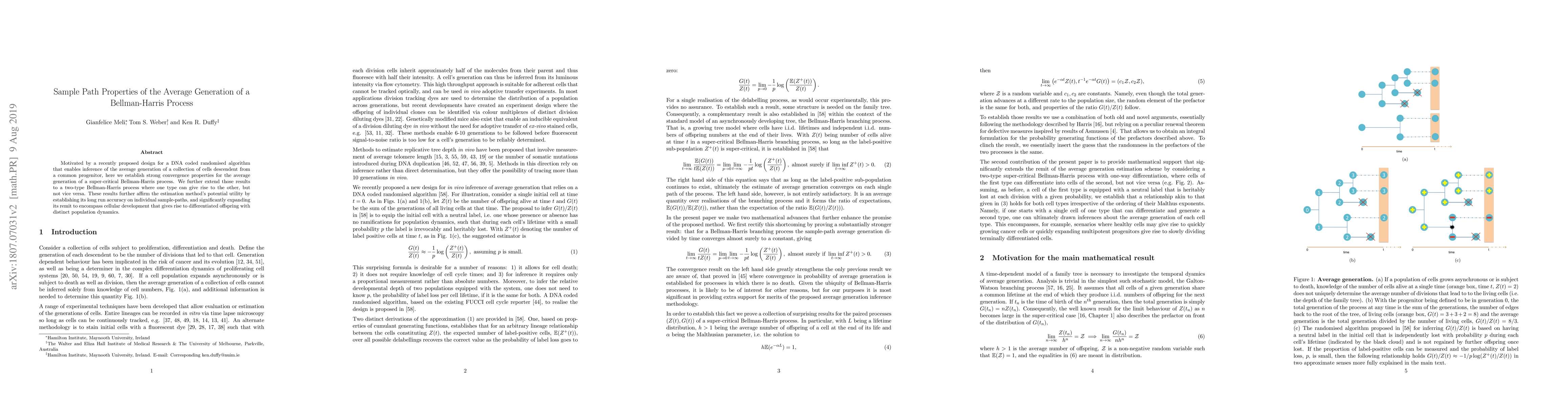Motivated by a recently proposed design for a DNA coded randomised algorithm that enables inference of the average generation of a collection of cells descendent from a common progenitor, here we establish strong convergence properties for the average generation of a super-critical Bellman-Harris process. We further extend those results to a two-type Bellman-Harris process where one type can give rise to the other, but not vice versa. These results further affirm the estimation method's potential utility by establishing its long run accuracy on individual sample-paths, and significantly expanding its remit to encompass cellular development that gives rise to differentiated offspring with distinct population dynamics.