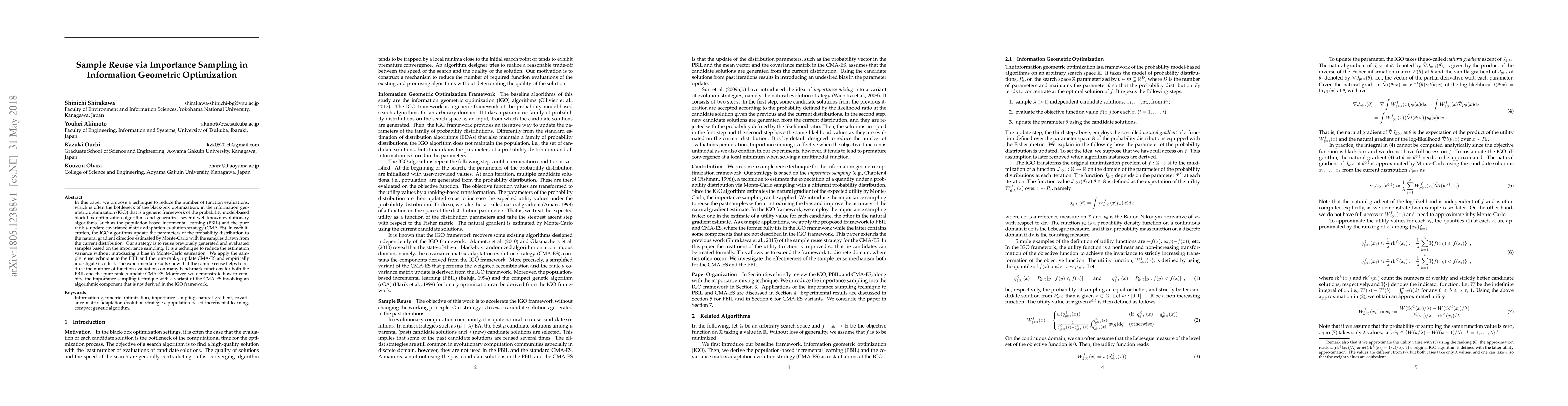 This paper proposes a sample reuse technique via importance sampling to reduce function evaluations in information geometric optimization (IGO) algorithms, including PBIL and CMA-ES. The method effectively lowers estimation variance without bias, leading to fewer evaluations on benchmark functions.