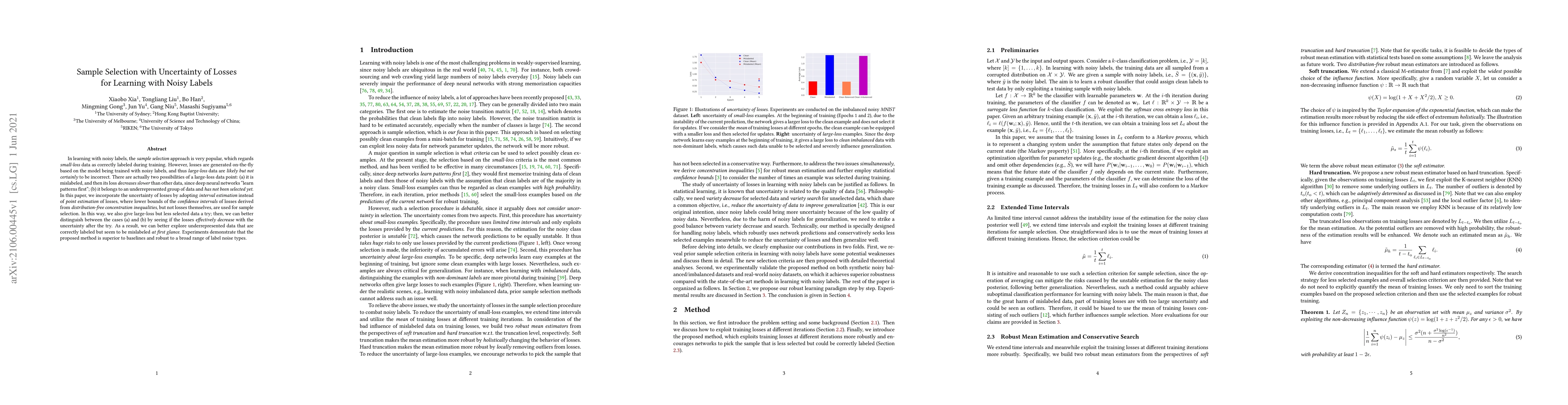 In learning with noisy labels, the sample selection approach is very popular, which regards small-loss data as correctly labeled during training. However, losses are generated on-the-fly based on the model being trained with noisy labels, and thus large-loss data are likely but not certainly to be incorrect. There are actually two possibilities of a large-loss data point: (a) it is mislabeled, and then its loss decreases slower than other data, since deep neural networks "learn patterns first"; (b) it belongs to an underrepresented group of data and has not been selected yet. In this paper, we incorporate the uncertainty of losses by adopting interval estimation instead of point estimation of losses, where lower bounds of the confidence intervals of losses derived from distribution-free concentration inequalities, but not losses themselves, are used for sample selection. In this way, we also give large-loss but less selected data a try; then, we can better distinguish between the cases (a) and (b) by seeing if the losses effectively decrease with the uncertainty after the try. As a result, we can better explore underrepresented data that are correctly labeled but seem to be mislabeled at first glance. Experiments demonstrate that the proposed method is superior to baselines and robust to a broad range of label noise types.