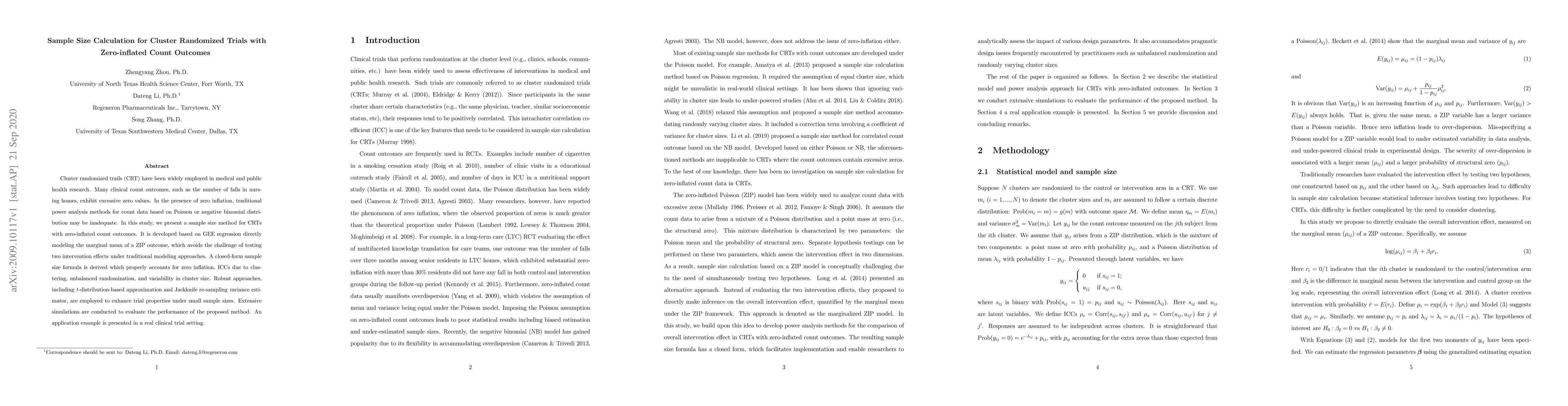 This paper proposes a novel sample size calculation method for cluster randomized trials with zero-inflated count outcomes, addressing the inadequacy of traditional methods in the presence of excessive zero values. The method uses GEE regression to model the marginal mean of zero-inflated Poisson outcomes, incorporating zero inflation, intracluster correlation, and cluster size variability.