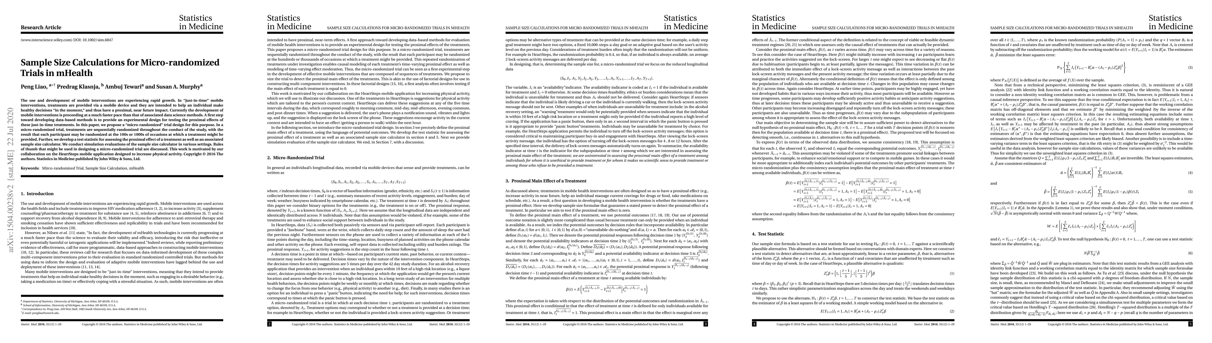This paper proposes a micro-randomized trial design for testing the proximal effects of just-in-time mobile interventions, developing a test statistic and a sample size calculator, and conducting simulations to evaluate the latter. The work is motivated by the HeartSteps mobile application aimed at increasing physical activity.