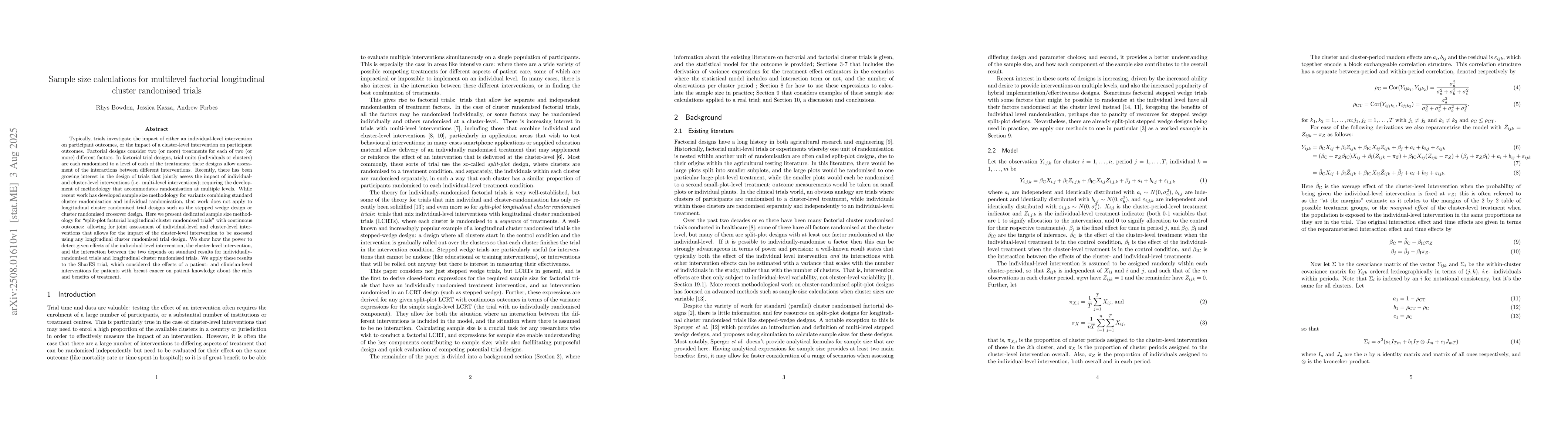 Typically, trials investigate the impact of either an individual-level intervention on participant outcomes, or the impact of a cluster-level intervention on participant outcomes. Factorial designs consider two (or more) treatments for each of two (or more) different factors. In factorial trial designs, trial units (individuals or clusters) are each randomised to a level of each of the treatments; these designs allow assessment of the interactions between different interventions. Recently, there has been growing interest in the design of trials that jointly assess the impact of individual- and cluster-level interventions (i.e. multi-level interventions); requiring the development of methodology that accommodates randomisation at multiple levels. While recent work has developed sample size methodology for variants combining standard cluster randomisation and individual randomisation, that work does not apply to longitudinal cluster randomised trial designs such as the stepped wedge design or cluster randomised crossover design. Here we present dedicated sample size methodology for "split-plot factorial longitudinal cluster randomised trials" with continuous outcomes: allowing for joint assessment of individual-level and cluster-level interventions that allows for the impact of the cluster-level intervention to be assessed using any longitudinal cluster randomised trial design. We show how the power to detect given effects of the individual-level intervention, the cluster-level intervention, and the interaction between the two depends on standard results for individually-randomised trials and longitudinal cluster randomised trials. We apply these results to the SharES trial, which considered the effects of a patient- and clinician-level interventions for patients with breast cancer on patient knowledge about the risks and benefits of treatment.