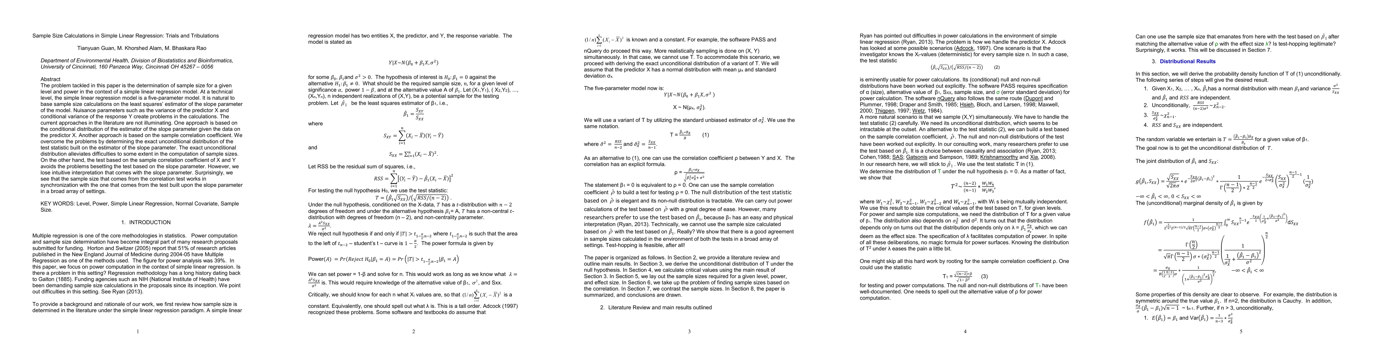 This paper addresses challenges in determining sample size for simple linear regression, proposing solutions to problems caused by nuisance parameters. It introduces exact unconditional distribution of a test statistic based on slope parameter estimator, and compares it with a test based on the correlation coefficient, finding that both yield similar sample sizes in various scenarios.