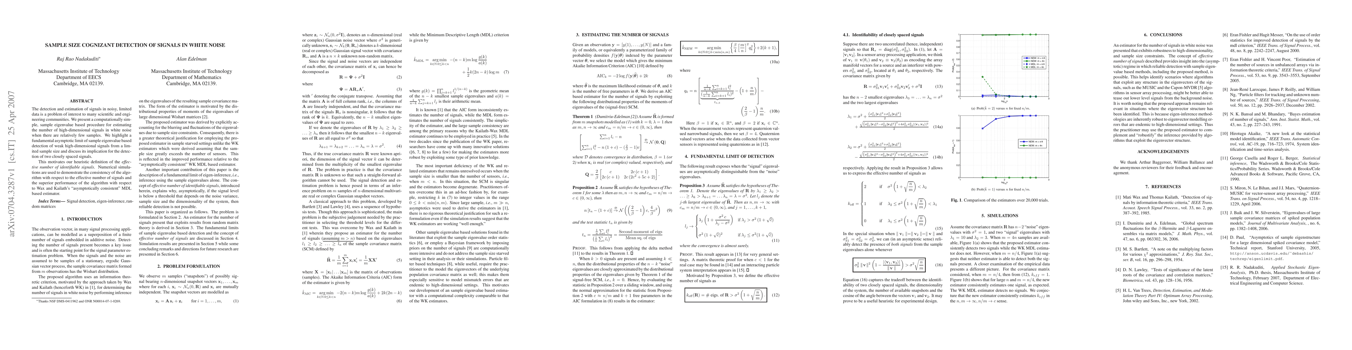 The detection and estimation of signals in noisy, limited data is a problem of interest to many scientific and engineering communities. We present a computationally simple, sample eigenvalue based procedure for estimating the number of high-dimensional signals in white noise when there are relatively few samples. We highlight a fundamental asymptotic limit of sample eigenvalue based detection of weak high-dimensional signals from a limited sample size and discuss its implication for the detection of two closely spaced signals. This motivates our heuristic definition of the 'effective number of identifiable signals.' Numerical simulations are used to demonstrate the consistency of the algorithm with respect to the effective number of signals and the superior performance of the algorithm with respect to Wax and Kailath's "asymptotically consistent" MDL based estimator.