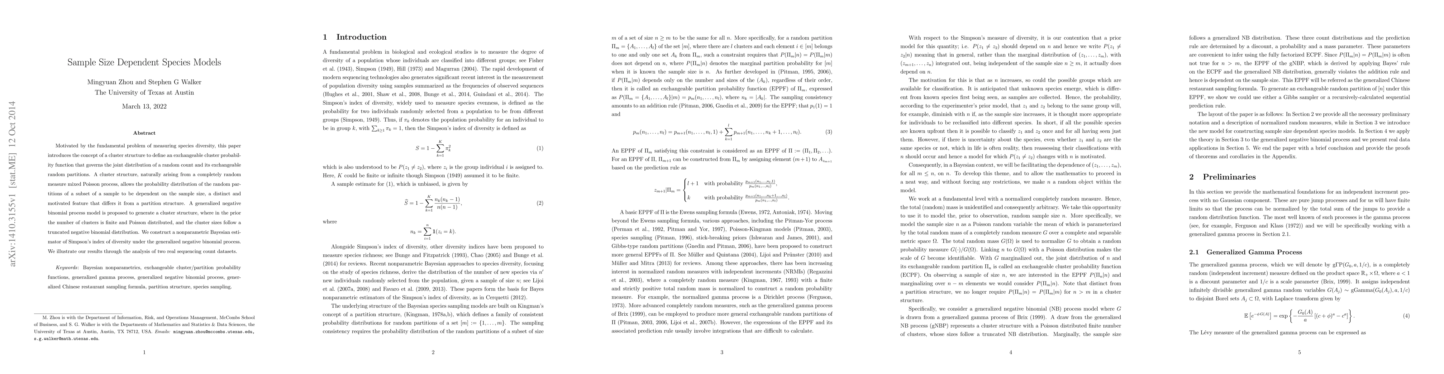 Motivated by the fundamental problem of measuring species diversity, this paper introduces the concept of a cluster structure to define an exchangeable cluster probability function that governs the joint distribution of a random count and its exchangeable random partitions. A cluster structure, naturally arising from a completely random measure mixed Poisson process, allows the probability distribution of the random partitions of a subset of a sample to be dependent on the sample size, a distinct and motivated feature that differs it from a partition structure. A generalized negative binomial process model is proposed to generate a cluster structure, where in the prior the number of clusters is finite and Poisson distributed, and the cluster sizes follow a truncated negative binomial distribution. We construct a nonparametric Bayesian estimator of Simpson's index of diversity under the generalized negative binomial process. We illustrate our results through the analysis of two real sequencing count datasets.
