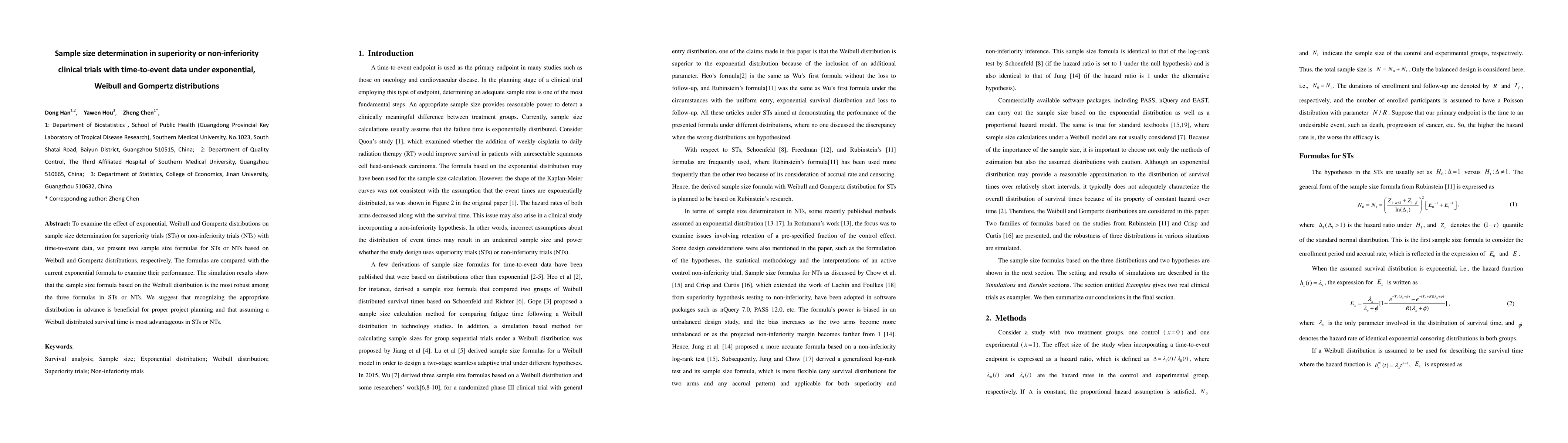 Researchers developed new sample size formulas for superiority and non-inferiority clinical trials with time-to-event data, finding the Weibull distribution formula to be the most robust.