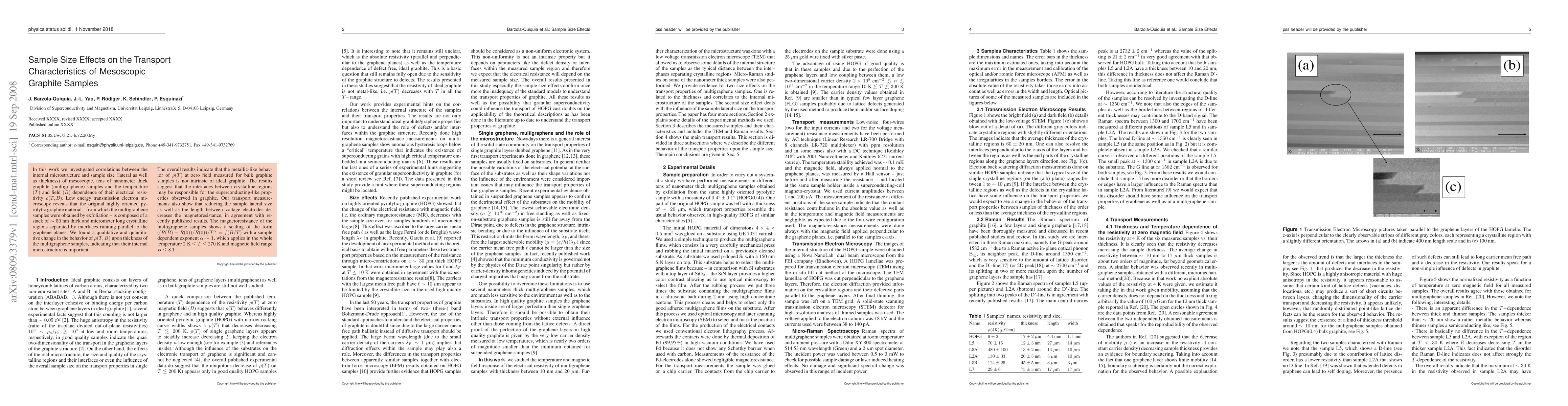 This research explores how sample size affects the transport characteristics of mesoscopic graphite samples, finding that the internal microstructure, including interfaces between crystalline regions, significantly influences electrical resistivity. The metallic-like behavior observed in bulk graphite is not intrinsic, and the study reveals superconducting-like properties likely due to these interfaces, with magnetoresistance scaling dependent on sample size and the relationship between temperature and magnetic field.