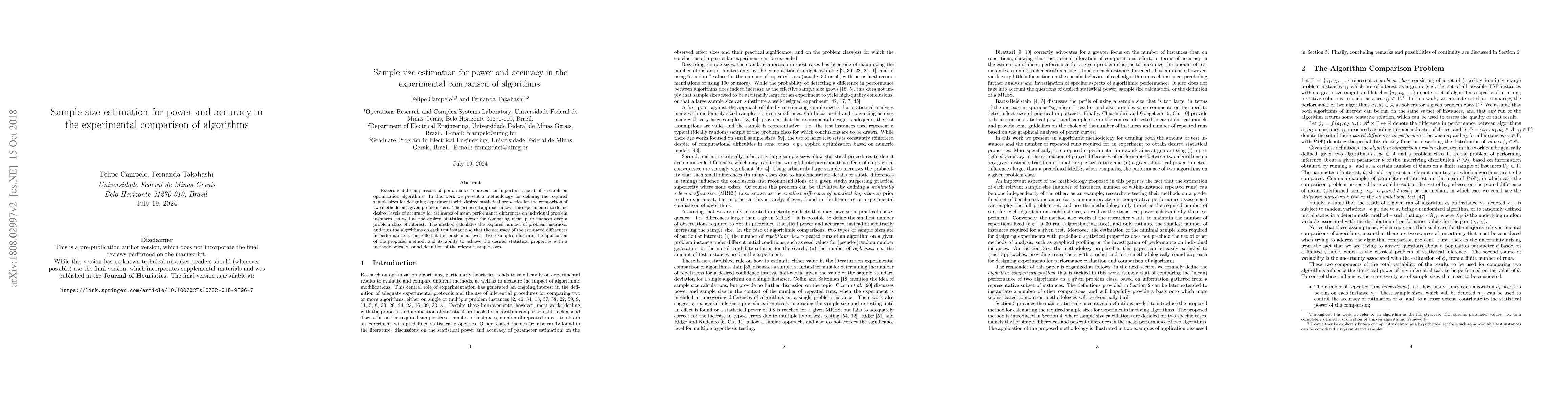 Experimental comparisons of performance represent an important aspect of research on optimization algorithms. In this work we present a methodology for defining the required sample sizes for designing experiments with desired statistical properties for the comparison of two methods on a given problem class. The proposed approach allows the experimenter to define desired levels of accuracy for estimates of mean performance differences on individual problem instances, as well as the desired statistical power for comparing mean performances over a problem class of interest. The method calculates the required number of problem instances, and runs the algorithms on each test instance so that the accuracy of the estimated differences in performance is controlled at the predefined level. Two examples illustrate the application of the proposed method, and its ability to achieve the desired statistical properties with a methodologically sound definition of the relevant sample sizes.