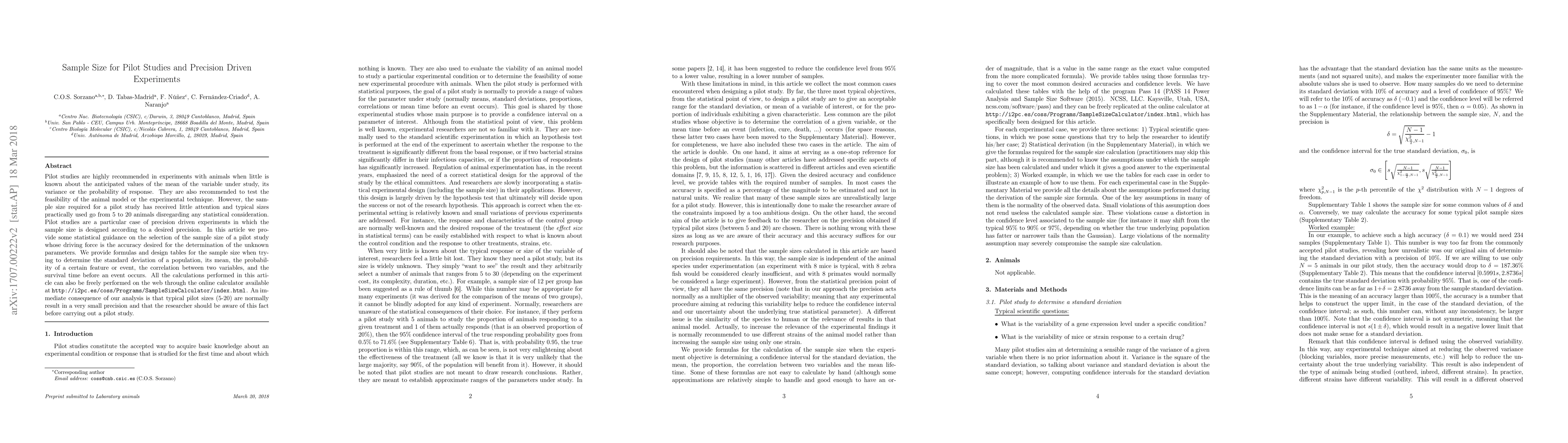 Pilot studies are highly recommended in experiments with animals when little is known about the anticipated values of the mean of the variable under study, its variance or the probability of response. They are also recommended to test the feasibility of the animal model or the experimental technique. However, the sample size required for a pilot study has received little attention and typical sizes practically used go from 5 to 20 animals disregarding any statistical consideration. Pilot studies are a particular case of precision driven experiments in which the sample size is designed according to a desired precision. In this article we provide some statistical guidance on the selection of the sample size of a pilot study whose driving force is the accuracy desired for the determination of the unknown parameters. We provide formulas and design tables for the sample size when trying to determine the standard deviation of a population, its mean, the probability of a certain feature or event, the correlation between two variables, and the survival time before an event occurs. All the calculations performed in this article can also be freely performed on the web through the online calculator available at http://i2pc.es/coss/Programs/SampleSizeCalculator/index.html. An immediate consequence of our analysis is that typical pilot sizes (5-20) are normally result in a very small precision and that the researcher should be aware of this fact before carrying out a pilot study.