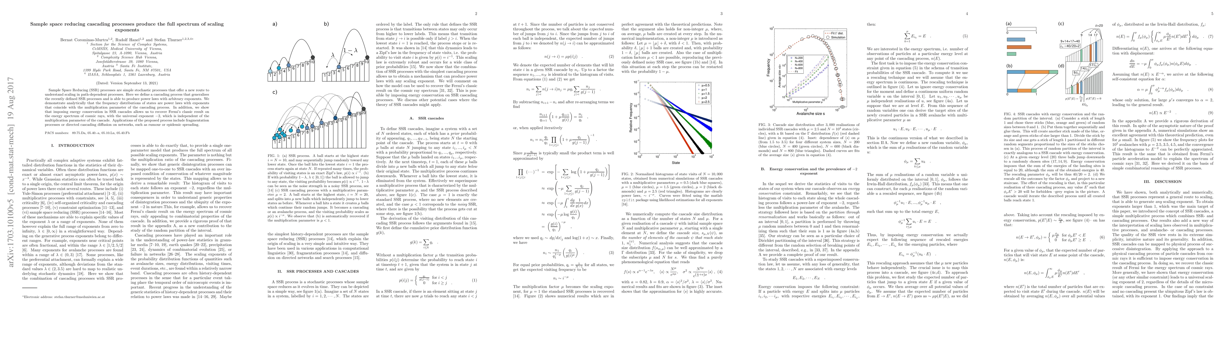 Sample Space Reducing (SSR) processes are simple stochastic processes that offer a new route to understand scaling in path-dependent processes. Here we define a cascading process that generalises the recently defined SSR processes and is able to produce power laws with arbitrary exponents. We demonstrate analytically that the frequency distributions of states are power laws with exponents that coincide with the multiplication parameter of the cascading process. In addition, we show that imposing energy conservation in SSR cascades allows us to recover Fermi's classic result on the energy spectrum of cosmic rays, with the universal exponent -2, which is independent of the multiplication parameter of the cascade. Applications of the proposed process include fragmentation processes or directed cascading diffusion on networks, such as rumour or epidemic spreading.