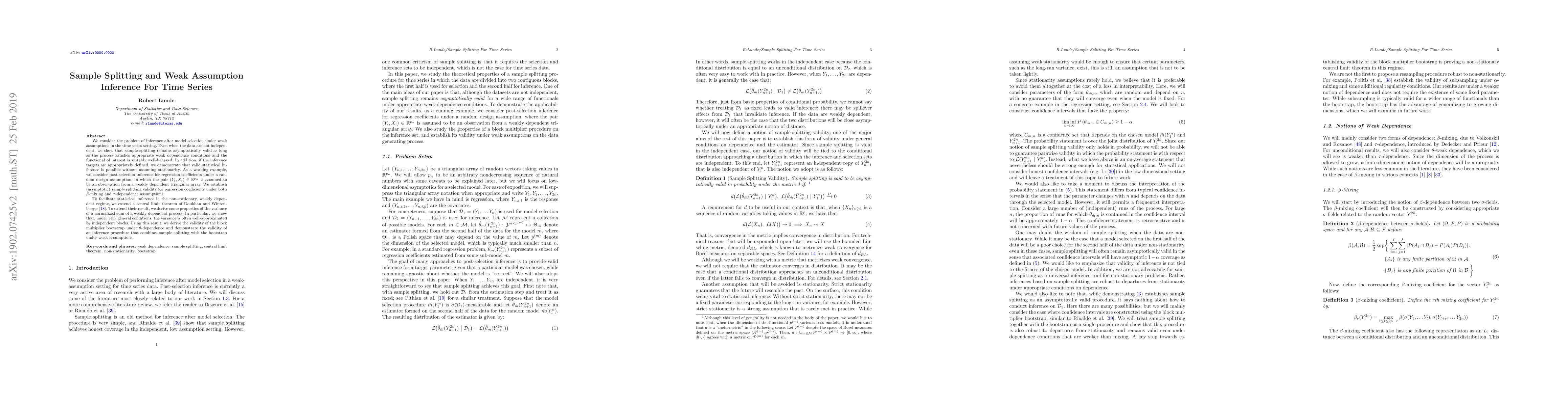 We consider the problem of inference after model selection under weak assumptions in the time series setting. Even when the data are not independent, we show that sample splitting remains asymptotically valid as long as the process satisfies appropriate weak dependence conditions and the functional of interest is suitably well-behaved. In addition, if the inference targets are appropriately defined, we demonstrate that valid statistical inference is possible without assuming stationarity. As a working example, we consider post-selection inference for regression coefficients under a random design assumption, in which the pair $(Y_i, X_i) \in \mathbb{R}^{p_n}$ is assumed to be an observation from a weakly dependent triangular array. We establish (asymptotic) sample splitting validity for regression coefficients under both $\beta$-mixing and $\tau$-dependence assumptions. To facilitate statistical inference in the non-stationary, weakly dependent regime, we extend a central limit theorem of Doukhan and Wintenberger (2007). To extend their result, we derive some properties of the variance of a normalized sum of a weakly dependent process. In particular, we show that, under very general conditions, the variance is often well-approximated by independent blocks. Using this result, we derive the validity of the block multiplier bootstrap under $\theta$-dependence and demonstrate the validity of an inference procedure that combines sample splitting with the bootstrap under weak assumptions.