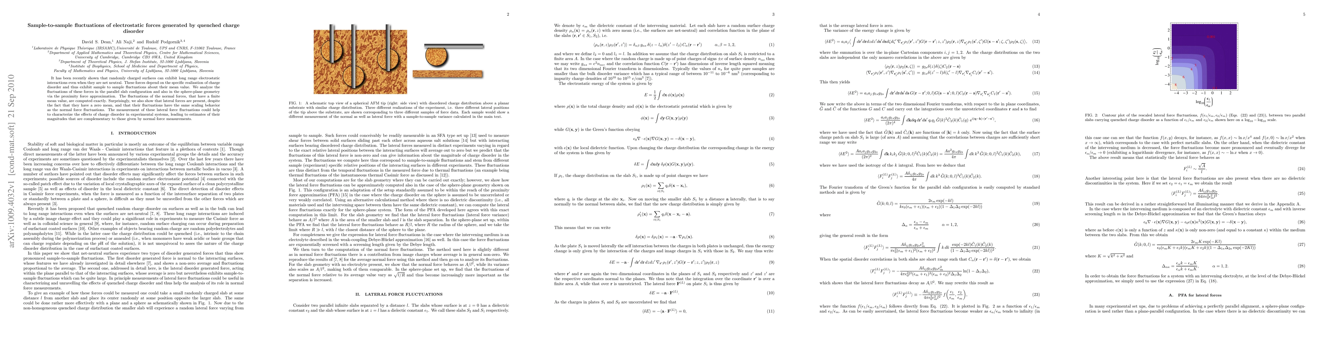 This paper investigates sample-to-sample fluctuations in electrostatic forces generated by quenched charge disorder on neutral surfaces, revealing both normal and lateral force fluctuations. The study uses the proximity force approximation to analyze these fluctuations in parallel slab and sphere-plane configurations, showing that lateral forces, despite having zero mean, exhibit significant fluctuations that scale similarly to normal force fluctuations.