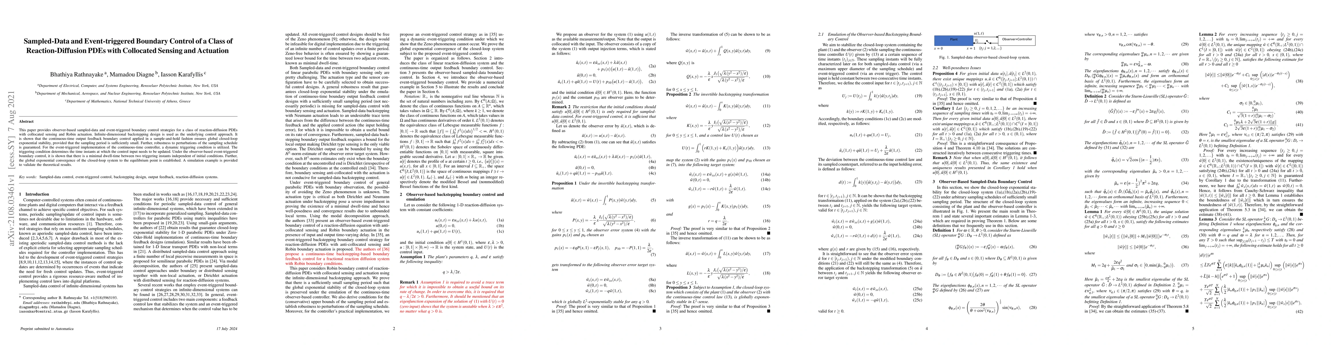 This paper develops sampled-data and event-triggered boundary control strategies for reaction-diffusion PDEs using observer-based infinite-dimensional backstepping, ensuring global exponential stability and robustness to sampling schedule perturbations. The event-triggered method guarantees minimal dwell-time between updates and global convergence.