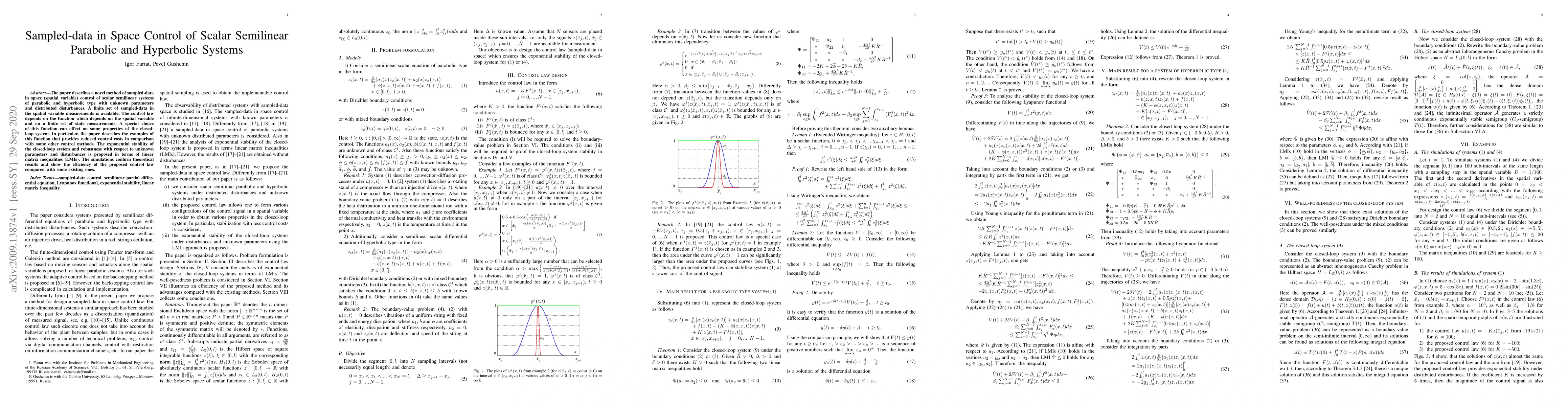 The paper describes a novel method of sampled-data in space (spatial variable) control of scalar semilinear systems of parabolic and hyperbolic type with unknown parameters and distributed disturbances. A finite set of sampled-data in the spatial variable measurements is available. The control law depends on the function which depends on the spatial variable and on a finite set of state measurements. A special choice of this function can affect on some properties of the closed-loop system. In particular, the paper describes the examples of this function that provides reduced control costs in comparison with some other control methods. The exponential stability of the closed-loop system and robustness with respect to unknown parameters and disturbances is proposed in terms of linear matrix inequalities (LMIs). The simulations confirm theoretical results and show the efficiency of the proposed control law compared with some existing ones.