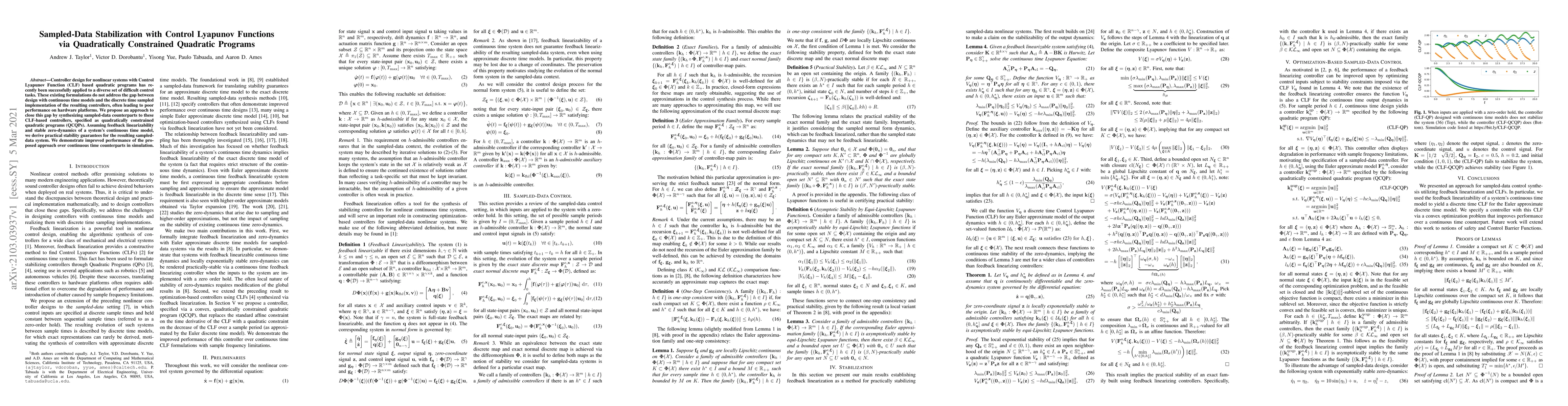 This paper proposes a method for designing sampled-data controllers for nonlinear systems using Control Lyapunov Functions (CLF) and quadratically constrained quadratic programs (QCQPs). The approach aims to bridge the gap between continuous-time design and discrete-time implementation, providing practical stability guarantees and demonstrating improved performance in simulations.