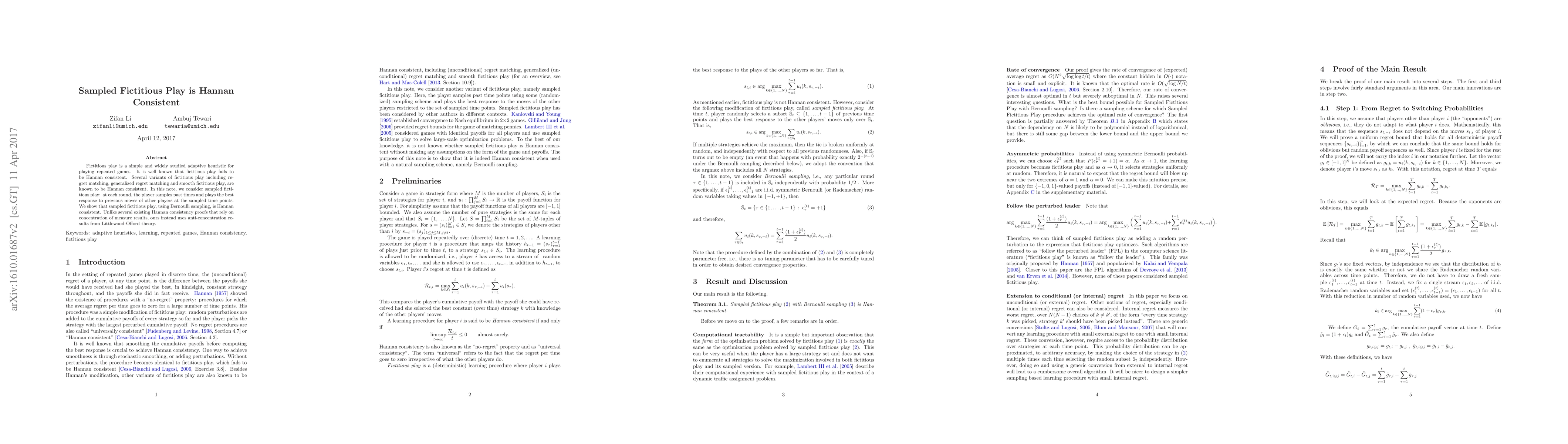 This paper demonstrates that sampled fictitious play, which samples past time points and plays the best response to previous moves, is Hannan consistent. Unlike previous proofs, this result is achieved using anti-concentration results from Littlewood-Offord theory rather than concentration of measure results.