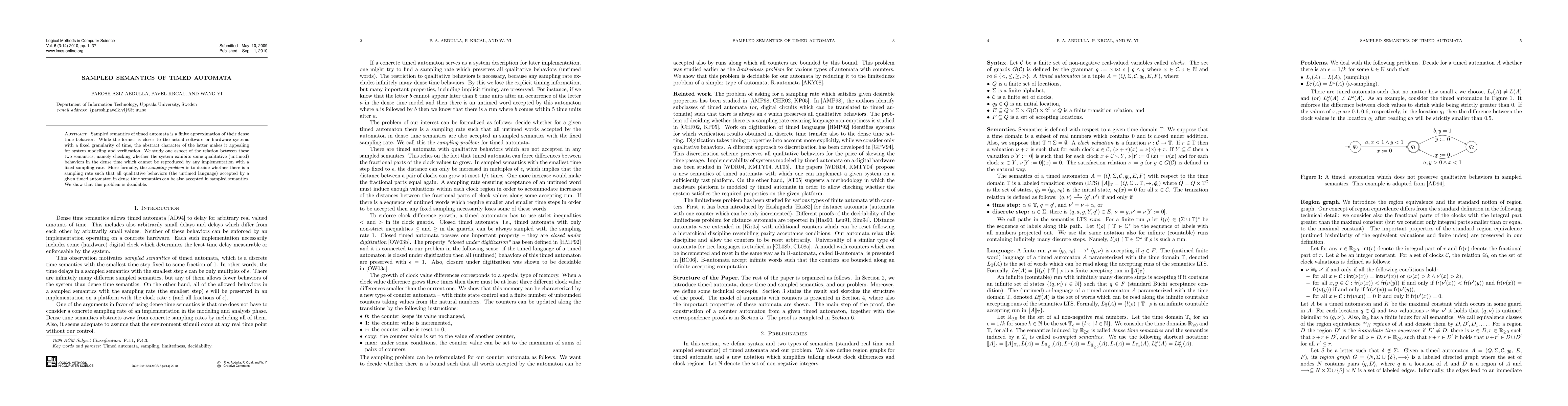 This paper investigates the sampled semantics of timed automata as a finite approximation of their dense time behavior, focusing on determining whether qualitative behaviors in dense time can be reproduced by any fixed sampling rate. The authors prove that the sampling problem, which asks whether all untimed behaviors in dense time semantics can be accepted in sampled semantics, is decidable.