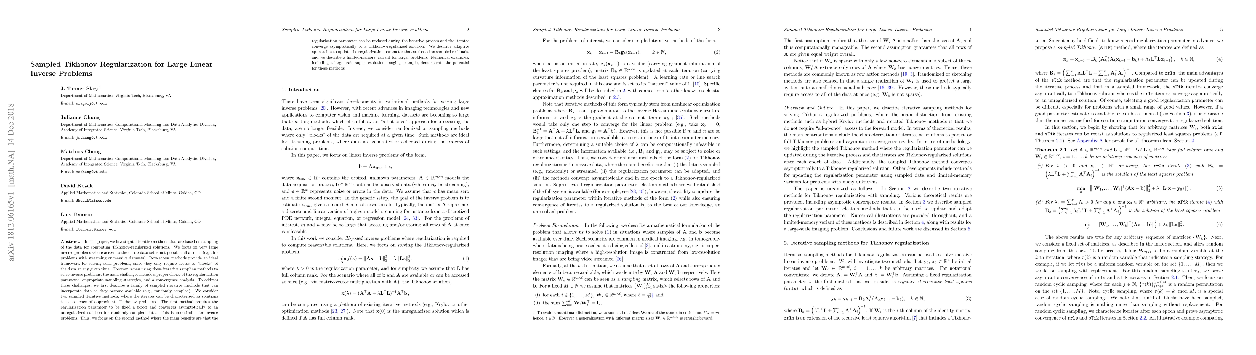 This paper explores iterative sampling methods for solving large linear inverse problems where full data access is impractical. It introduces two sampled iterative methods for Tikhonov regularization, focusing on adaptive regularization parameter updates and convergence analysis, with numerical examples demonstrating their effectiveness.