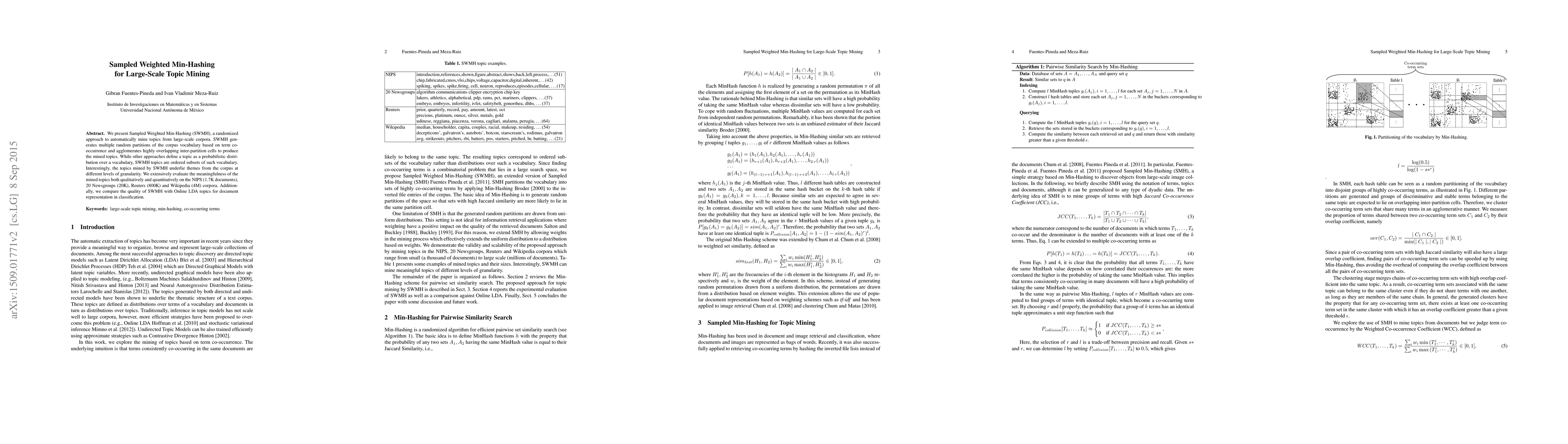 We present Sampled Weighted Min-Hashing (SWMH), a randomized approach to automatically mine topics from large-scale corpora. SWMH generates multiple random partitions of the corpus vocabulary based on term co-occurrence and agglomerates highly overlapping inter-partition cells to produce the mined topics. While other approaches define a topic as a probabilistic distribution over a vocabulary, SWMH topics are ordered subsets of such vocabulary. Interestingly, the topics mined by SWMH underlie themes from the corpus at different levels of granularity. We extensively evaluate the meaningfulness of the mined topics both qualitatively and quantitatively on the NIPS (1.7 K documents), 20 Newsgroups (20 K), Reuters (800 K) and Wikipedia (4 M) corpora. Additionally, we compare the quality of SWMH with Online LDA topics for document representation in classification.