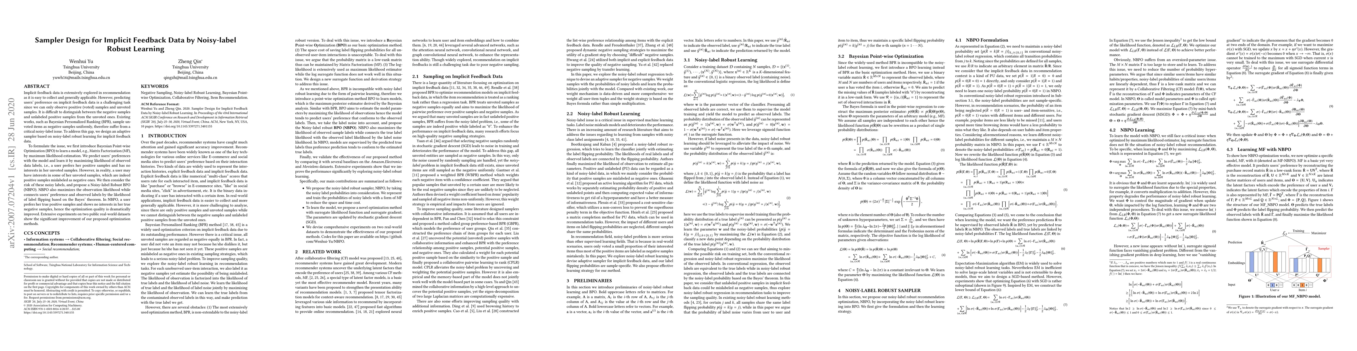 This paper proposes an adaptive sampler based on noisy-label robust learning to address the challenge of implicit feedback data in recommendation systems. The authors introduce Noisy-label Robust Bayesian Point-wise Optimization (NBPO) to improve the distinction between true negative and mislabeled positive samples, leading to significant performance improvements demonstrated on real-world datasets.