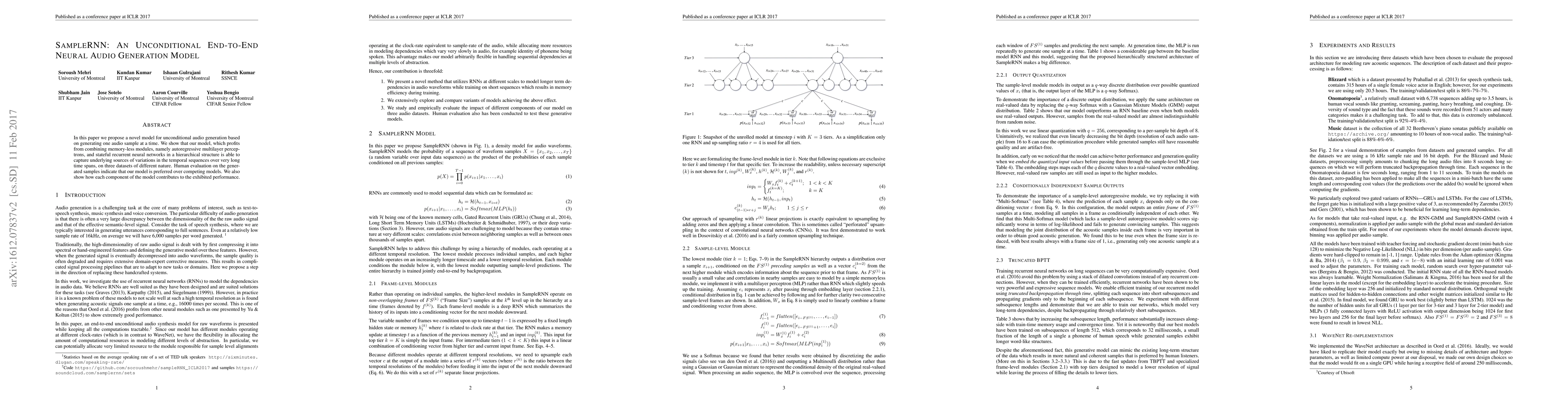 Researchers proposed a new model for generating high-quality audio samples without any input, using a combination of autoregressive and recurrent neural networks. Their model outperformed competitors in human evaluations.
