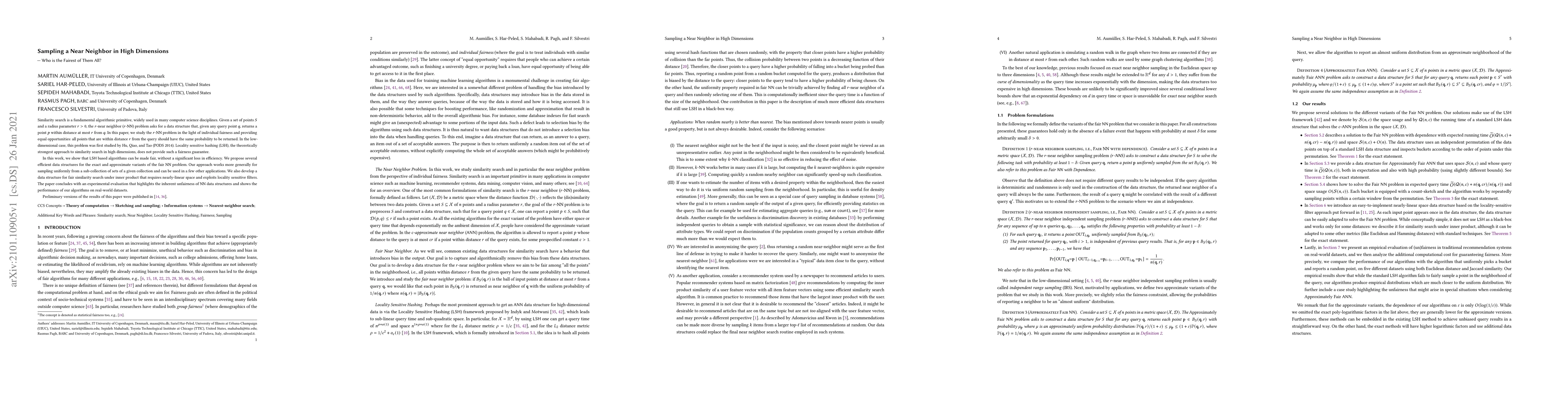 Similarity search is a fundamental algorithmic primitive, widely used in many computer science disciplines. Given a set of points $S$ and a radius parameter $r>0$, the $r$-near neighbor ($r$-NN) problem asks for a data structure that, given any query point $q$, returns a point $p$ within distance at most $r$ from $q$. In this paper, we study the $r$-NN problem in the light of individual fairness and providing equal opportunities: all points that are within distance $r$ from the query should have the same probability to be returned. In the low-dimensional case, this problem was first studied by Hu, Qiao, and Tao (PODS 2014). Locality sensitive hashing (LSH), the theoretically strongest approach to similarity search in high dimensions, does not provide such a fairness guarantee. In this work, we show that LSH based algorithms can be made fair, without a significant loss in efficiency. We propose several efficient data structures for the exact and approximate variants of the fair NN problem. Our approach works more generally for sampling uniformly from a sub-collection of sets of a given collection and can be used in a few other applications. We also develop a data structure for fair similarity search under inner product that requires nearly-linear space and exploits locality sensitive filters. The paper concludes with an experimental evaluation that highlights the inherent unfairness of NN data structures and shows the performance of our algorithms on real-world datasets.