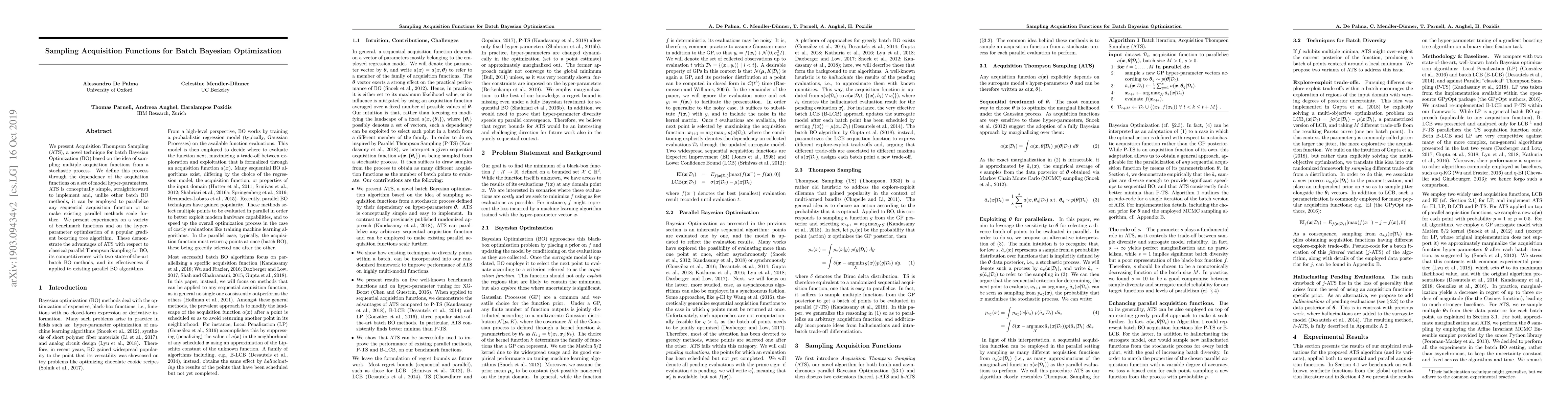 The paper introduces Acquisition Thompson Sampling (ATS), a novel technique for batch Bayesian Optimization (BO) based on sampling multiple acquisition functions from a stochastic process dependent on surrogate model hyper-parameters. ATS is simple, easy to implement, and can parallelize any sequential acquisition function or scale existing parallel methods.