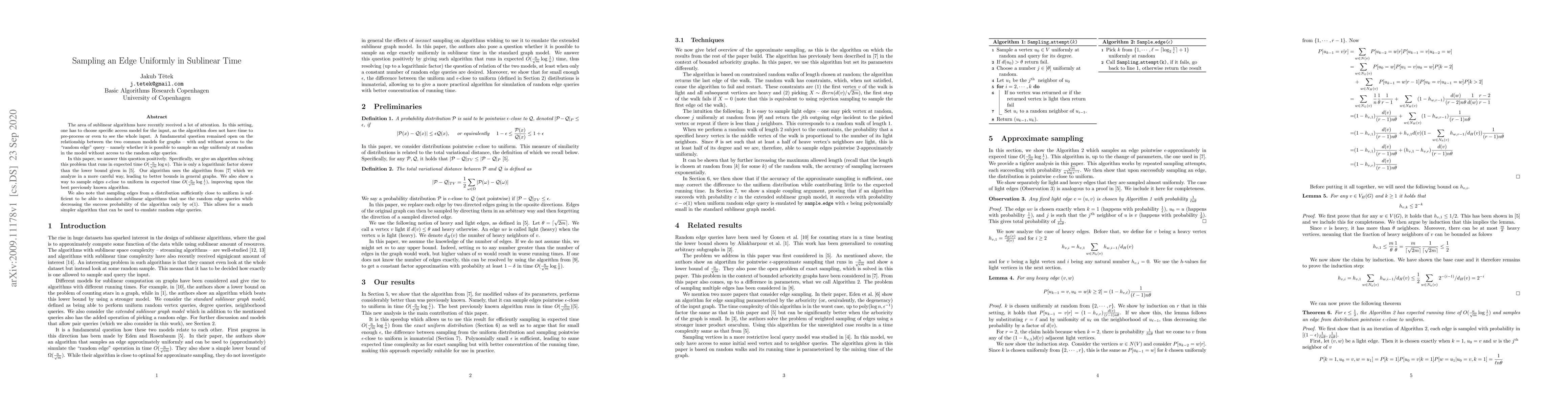 This paper presents an algorithm that samples an edge uniformly at random in sublinear time, specifically in $O(\frac{n}{\sqrt{m}} \log n)$ time, addressing a longstanding open question in sublinear algorithms. The authors also improve upon previous results by providing an $\epsilon$-close to uniform sampling method in $O(\frac{n}{\sqrt{m}} \log \frac{1}{\epsilon})$ time.