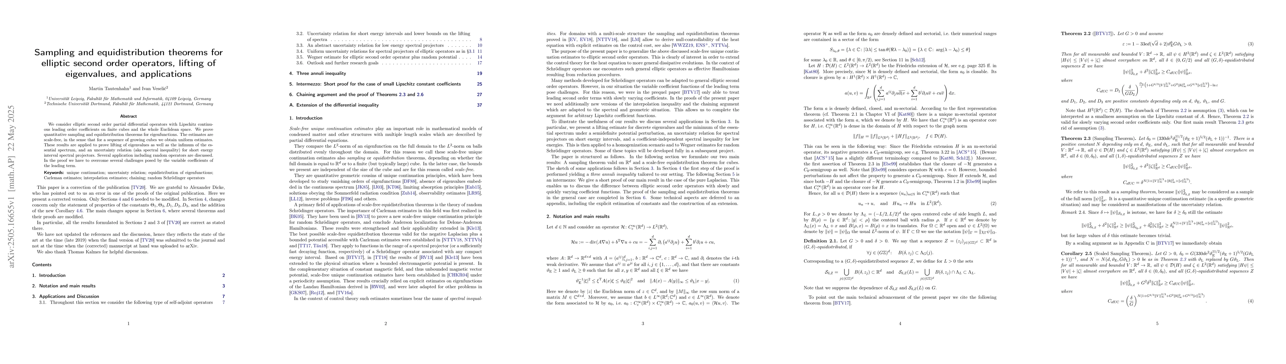 The paper proves scale-free sampling and equidistribution theorems for eigenfunctions of elliptic second-order operators with Lipschitz continuous leading order coefficients, with applications to lifting eigenvalues and infimum of essential spectrum.