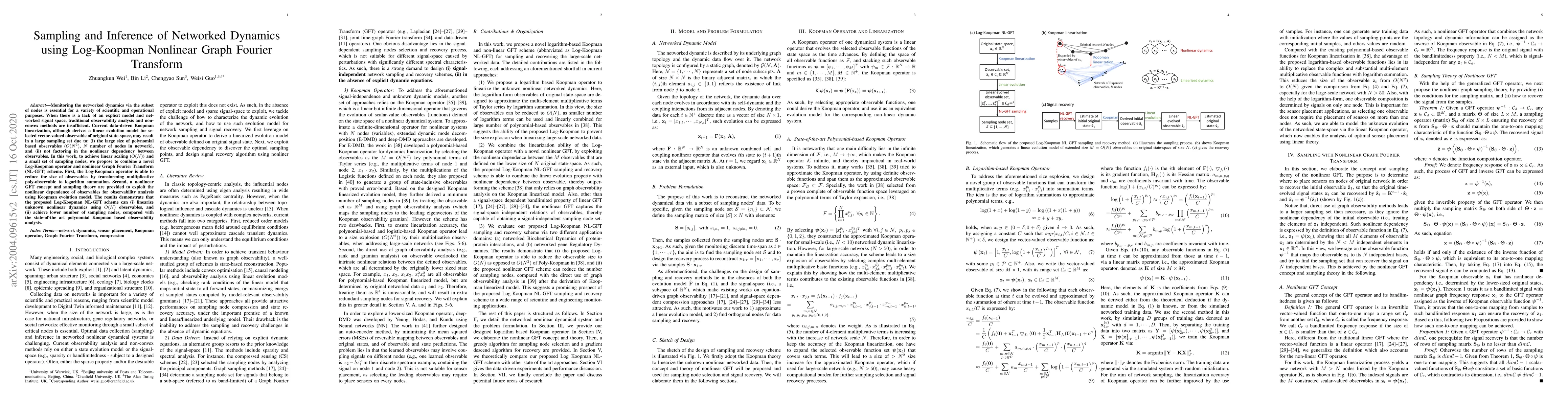 This paper proposes a Log-Koopman operator combined with a nonlinear Graph Fourier Transform (NL-GFT) to efficiently sample and infer networked nonlinear dynamics. The method reduces the size of observables and leverages nonlinear dependencies, achieving linear scaling and fewer sampling nodes compared to traditional polynomial Koopman methods.