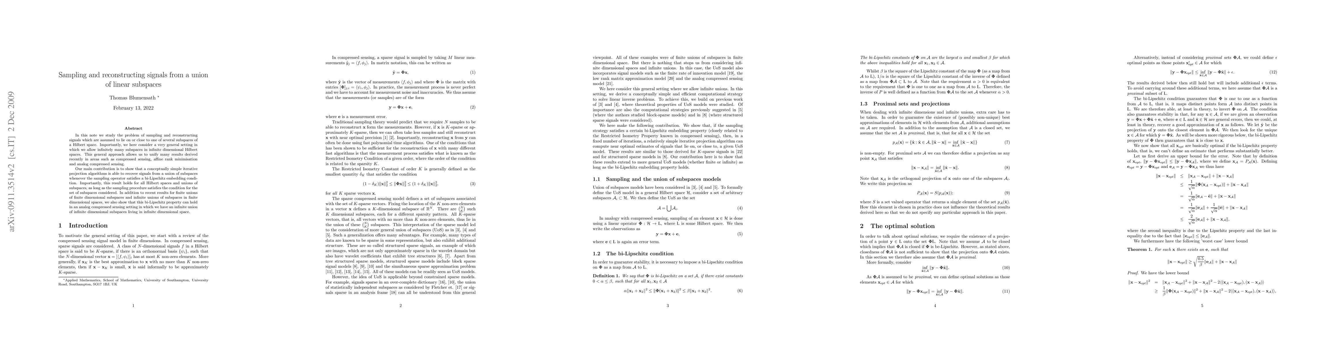 In this note we study the problem of sampling and reconstructing signals which are assumed to lie on or close to one of several subspaces of a Hilbert space. Importantly, we here consider a very general setting in which we allow infinitely many subspaces in infinite dimensional Hilbert spaces. This general approach allows us to unify many results derived recently in areas such as compressed sensing, affine rank minimisation and analog compressed sensing. Our main contribution is to show that a conceptually simple iterative projection algorithms is able to recover signals from a union of subspaces whenever the sampling operator satisfies a bi-Lipschitz embedding condition. Importantly, this result holds for all Hilbert spaces and unions of subspaces, as long as the sampling procedure satisfies the condition for the set of subspaces considered. In addition to recent results for finite unions of finite dimensional subspaces and infinite unions of subspaces in finite dimensional spaces, we also show that this bi-Lipschitz property can hold in an analog compressed sensing setting in which we have an infinite union of infinite dimensional subspaces living in infinite dimensional space.