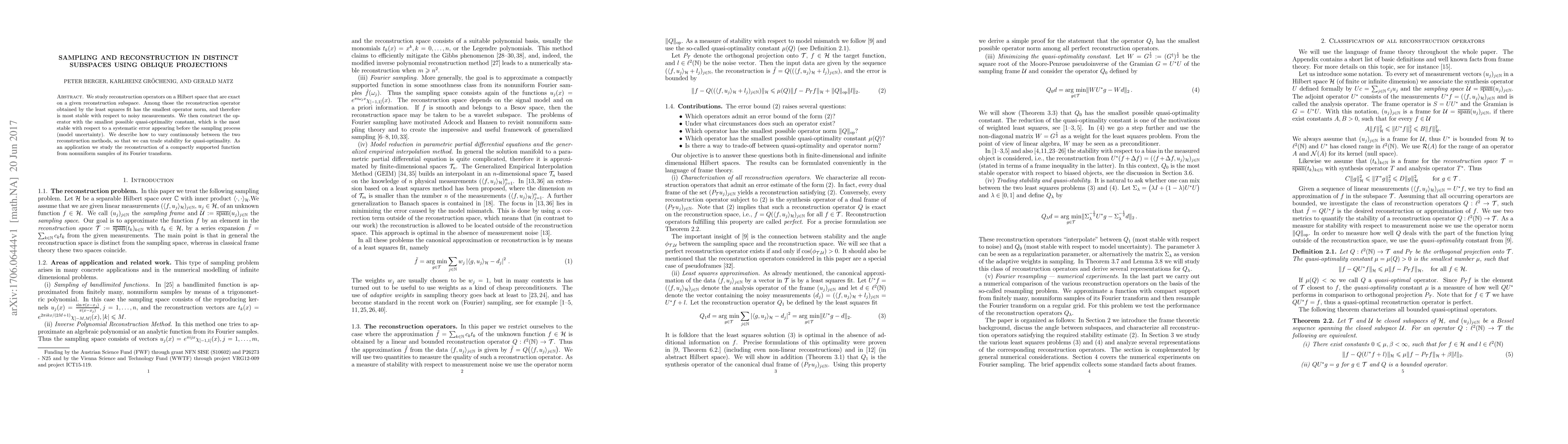 This paper investigates reconstruction operators in Hilbert space that are exact on a given subspace, focusing on the least squares fit for stability against noise and a quasi-optimal method for systematic error. It describes a continuous transition between these methods, applying the findings to reconstruct compactly supported functions from nonuniform Fourier transform samples.