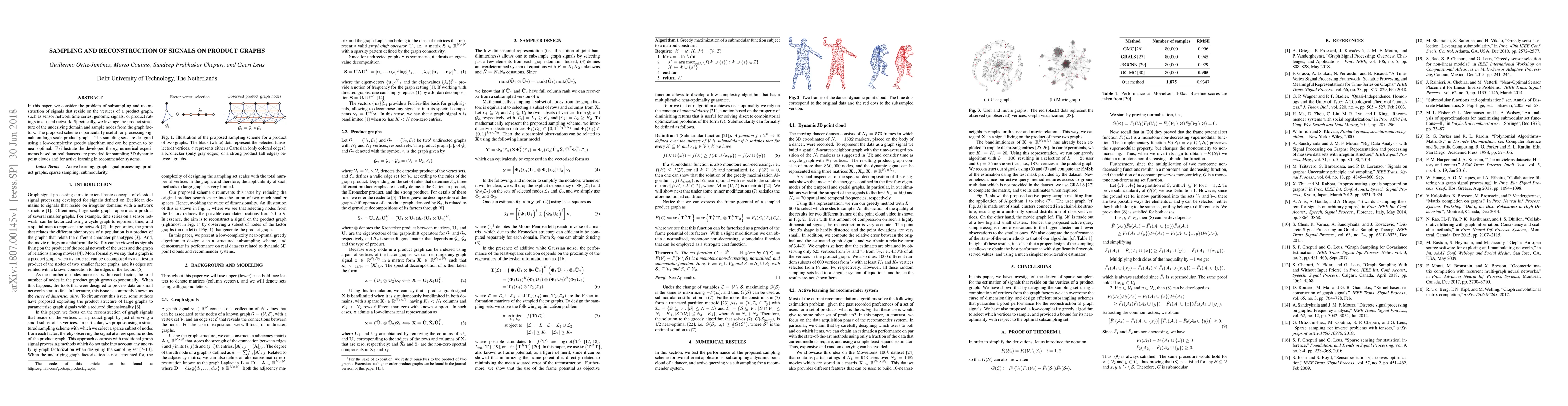 This paper proposes a method for subsampling and reconstructing signals on product graphs, utilizing the graph's product structure to sample nodes efficiently. The approach employs a low-complexity greedy algorithm for near-optimal sampling, demonstrated through experiments on real datasets for dynamic point clouds and recommender systems.