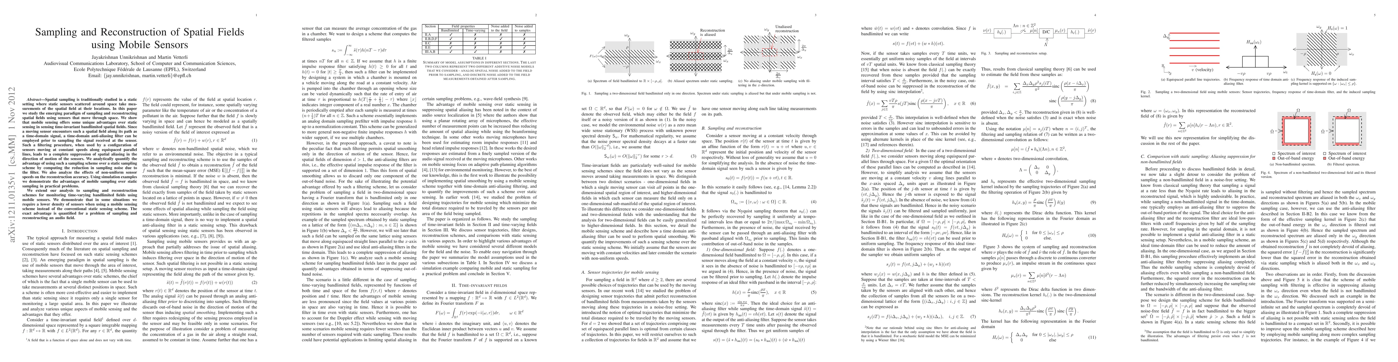 This paper explores the advantages of using mobile sensors for sampling and reconstructing spatial fields compared to static sensors. It demonstrates that mobile sensing can completely suppress spatial aliasing through time-domain filtering, leading to reduced sampling noise and potentially requiring fewer sensors for accurate reconstruction, as shown through simulations and an example of audio field reconstruction.