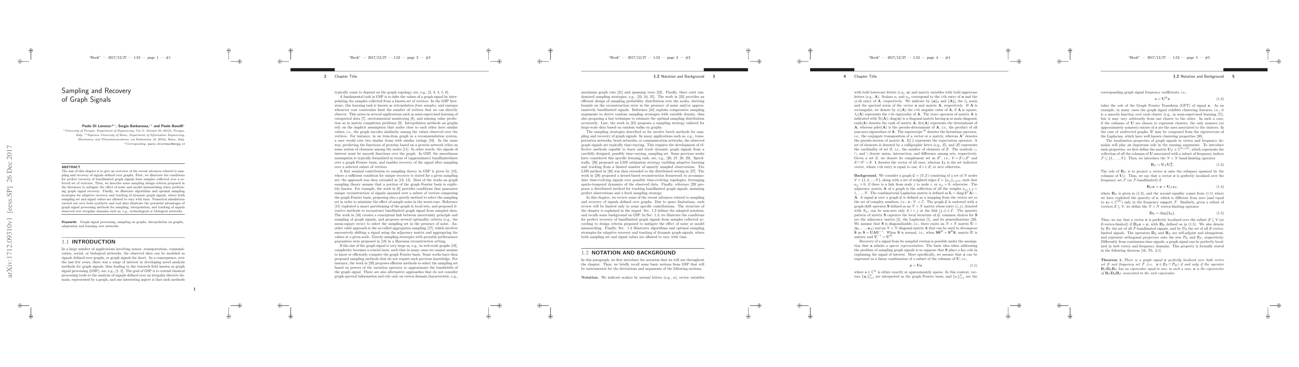The aim of this chapter is to give an overview of the recent advances related to sampling and recovery of signals defined over graphs. First, we illustrate the conditions for perfect recovery of bandlimited graph signals from samples collected over a selected set of vertexes. Then, we describe some sampling design criteria proposed in the literature to mitigate the effect of noise and model mismatching when performing graph signal recovery. Finally, we illustrate algorithms and optimal sampling strategies for adaptive recovery and tracking of dynamic graph signals, where both sampling set and signal values are allowed to vary with time. Numerical simulations carried out over both synthetic and real data illustrate the potential advantages of graph signal processing methods for sampling, interpolation, and tracking of signals observed over irregular domains such as, e.g., technological or biological networks.
