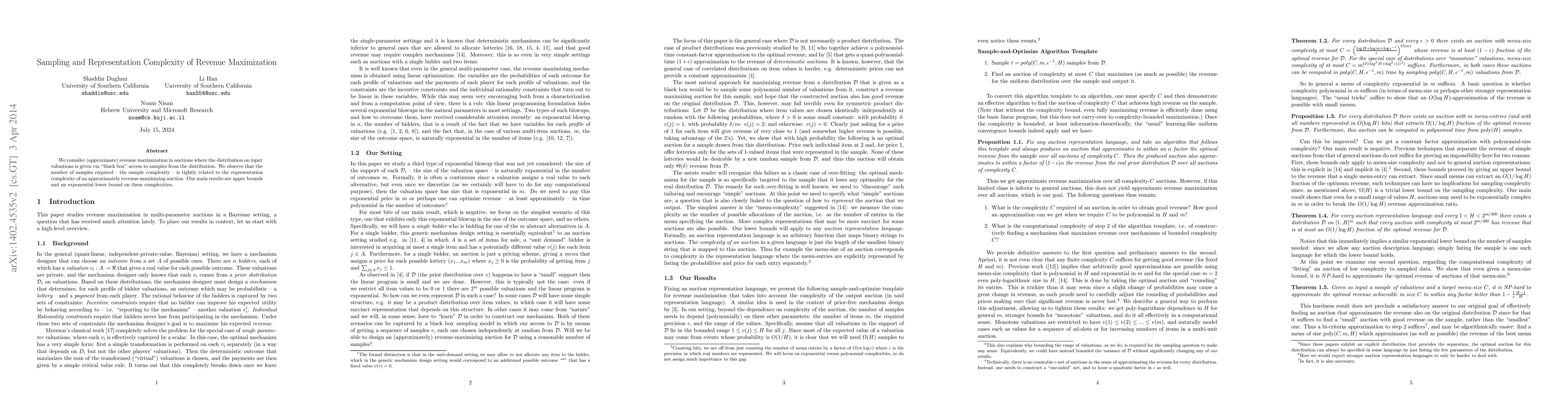 This paper investigates the sample complexity and representation complexity for revenue maximization in auctions with valuation samples provided via a black box. It establishes upper bounds and an exponential lower bound on the number of samples required to achieve approximately revenue-maximizing auctions.