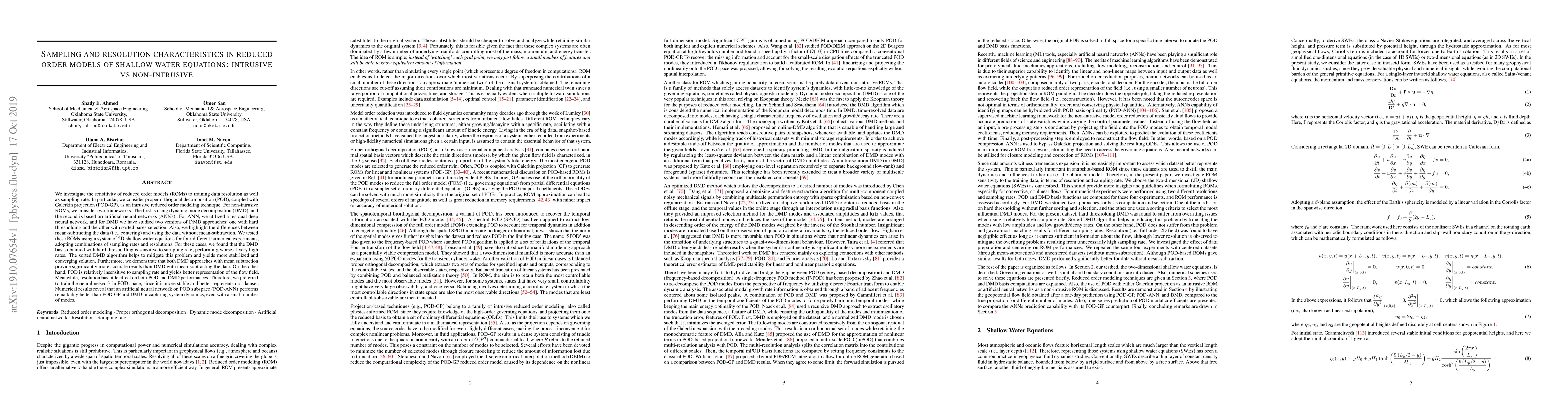 We investigate the sensitivity of reduced order models (ROMs) to training data resolution as well as sampling rate. In particular, we consider proper orthogonal decomposition (POD), coupled with Galerkin projection (POD-GP), as an intrusive reduced order modeling technique. For non-intrusive ROMs, we consider two frameworks. The first is using dynamic mode decomposition (DMD), and the second is based on artificial neural networks (ANNs). For ANN, we utilized a residual deep neural network, and for DMD we have studied two versions of DMD approaches; one with hard thresholding and the other with sorted bases selection. Also, we highlight the differences between mean-subtracting the data (i.e., centering) and using the data without mean-subtraction. We tested these ROMs using a system of 2D shallow water equations for four different numerical experiments, adopting combinations of sampling rates and resolutions. For these cases, we found that the DMD basis obtained with hard threshodling is sensitive to sampling rate, performing worse at very high rates. The sorted DMD algorithm helps to mitigate this problem and yields more stabilized and converging solution. Furthermore, we demonstrate that both DMD approaches with mean subtraction provide significantly more accurate results than DMD with mean-subtracting the data. On the other hand, POD is relatively insensitive to sampling rate and yields better representation of the flow field. Meanwhile, resolution has little effect on both POD and DMD performances. Therefore, we preferred to train the neural network in POD space, since it is more stable and better represents our dataset. Numerical results reveal that an artificial neural network on POD subspace (POD-ANN) performs remarkably better than POD-GP and DMD in capturing system dynamics, even with a small number of modes.
