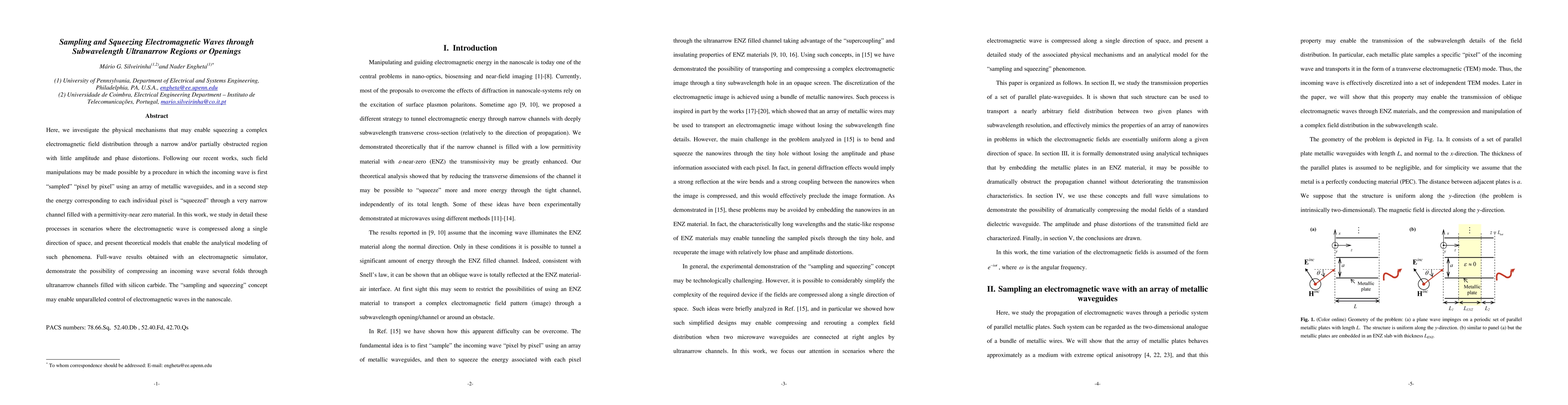 Here, we investigate the physical mechanisms that may enable squeezing a complex electromagnetic field distribution through a narrow and/or partially obstructed region with little amplitude and phase distortions. Following our recent works, such field manipulations may be made possible by a procedure in which the incoming wave is first "sampled" "pixel by pixel" using an array of metallic waveguides, and in a second step the energy corresponding to each individual pixel is "squeezed" through a very narrow channel filled with a permittivity-near zero material. In this work, we study in detail these processes in scenarios where the electromagnetic wave is compressed along a single direction of space, and present theoretical models that enable the analytical modeling of such phenomena. Full-wave results obtained with an electromagnetic simulator, demonstrate the possibility of compressing an incoming wave several folds through ultranarrow channels filled with silicon carbide. The "sampling and squeezing" concept may enable unparalleled control of electromagnetic waves in the nanoscale.