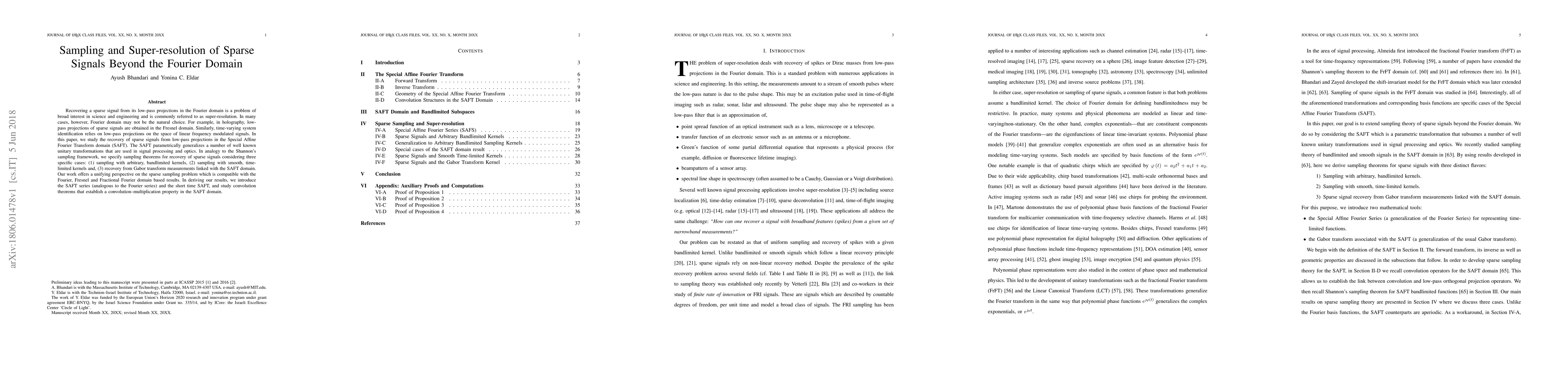 Recovering a sparse signal from its low-pass projections in the Fourier domain is a problem of broad interest in science and engineering and is commonly referred to as super-resolution. In many cases, however, Fourier domain may not be the natural choice. For example, in holography, low-pass projections of sparse signals are obtained in the Fresnel domain. Similarly, time-varying system identification relies on low-pass projections on the space of linear frequency modulated signals. In this paper, we study the recovery of sparse signals from low-pass projections in the Special Affine Fourier Transform domain (SAFT). The SAFT parametrically generalizes a number of well known unitary transformations that are used in signal processing and optics. In analogy to the Shannon's sampling framework, we specify sampling theorems for recovery of sparse signals considering three specific cases: (1) sampling with arbitrary, bandlimited kernels, (2) sampling with smooth, time-limited kernels and, (3) recovery from Gabor transform measurements linked with the SAFT domain. Our work offers a unifying perspective on the sparse sampling problem which is compatible with the Fourier, Fresnel and Fractional Fourier domain based results. In deriving our results, we introduce the SAFT series (analogous to the Fourier series) and the short time SAFT, and study convolution theorems that establish a convolution--multiplication property in the SAFT domain.