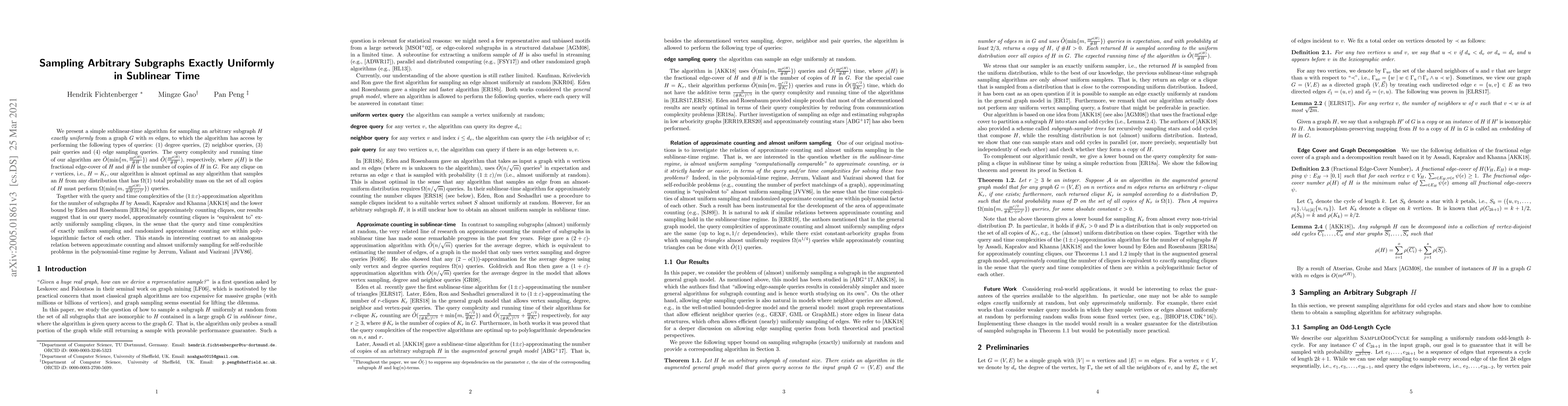 This paper introduces a sublinear-time algorithm for exactly uniform sampling of arbitrary subgraphs $H$ from graph $G$, achieving query complexity $\tilde{O}(\min\{m, \frac{m^{\rho(H)}}{\# H}\})$ and running time $\tilde{O}(\frac{m^{\rho(H)}}{\# H})$. The results suggest that in their query model, approximate counting and exactly uniform sampling of cliques are nearly equivalent in terms of complexity.